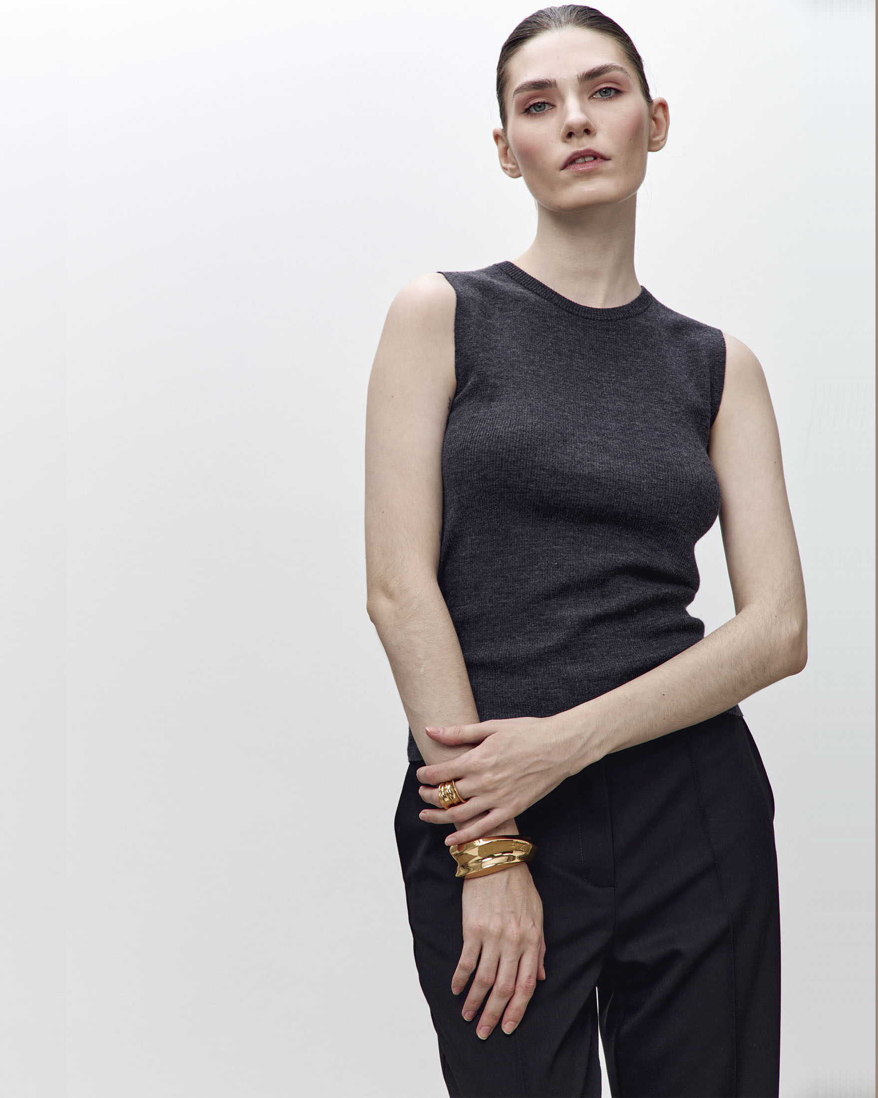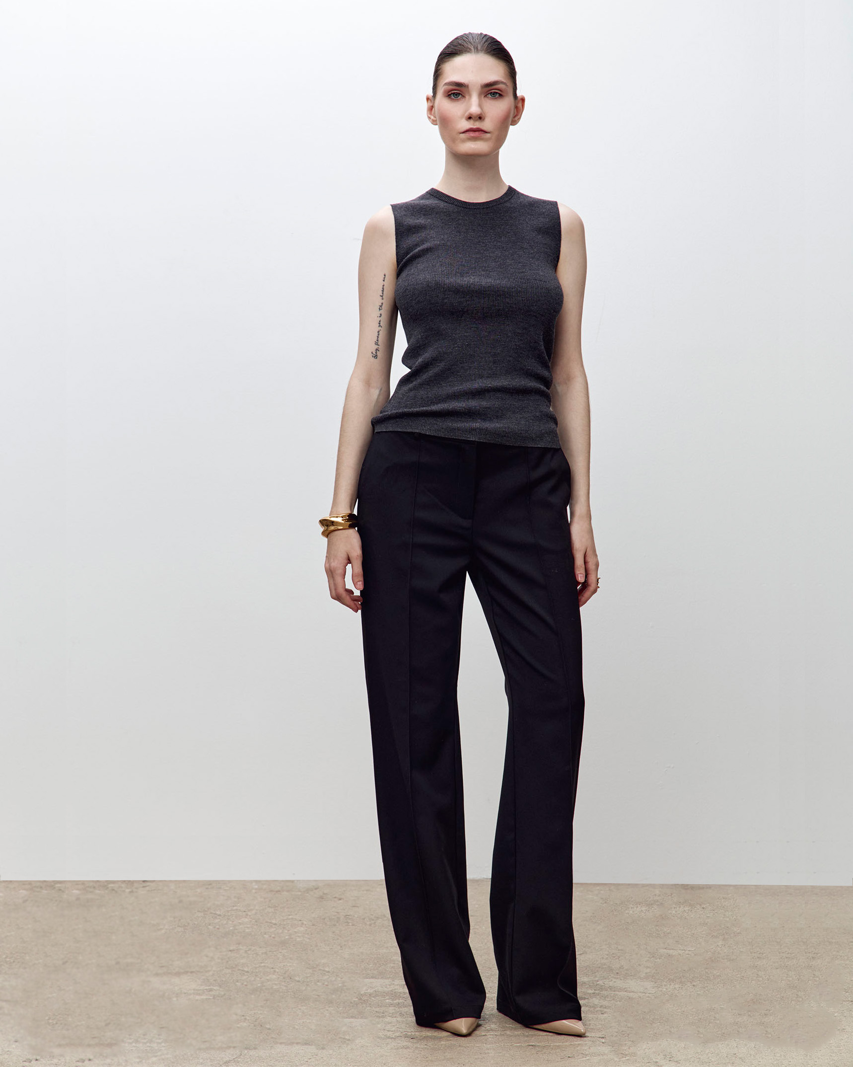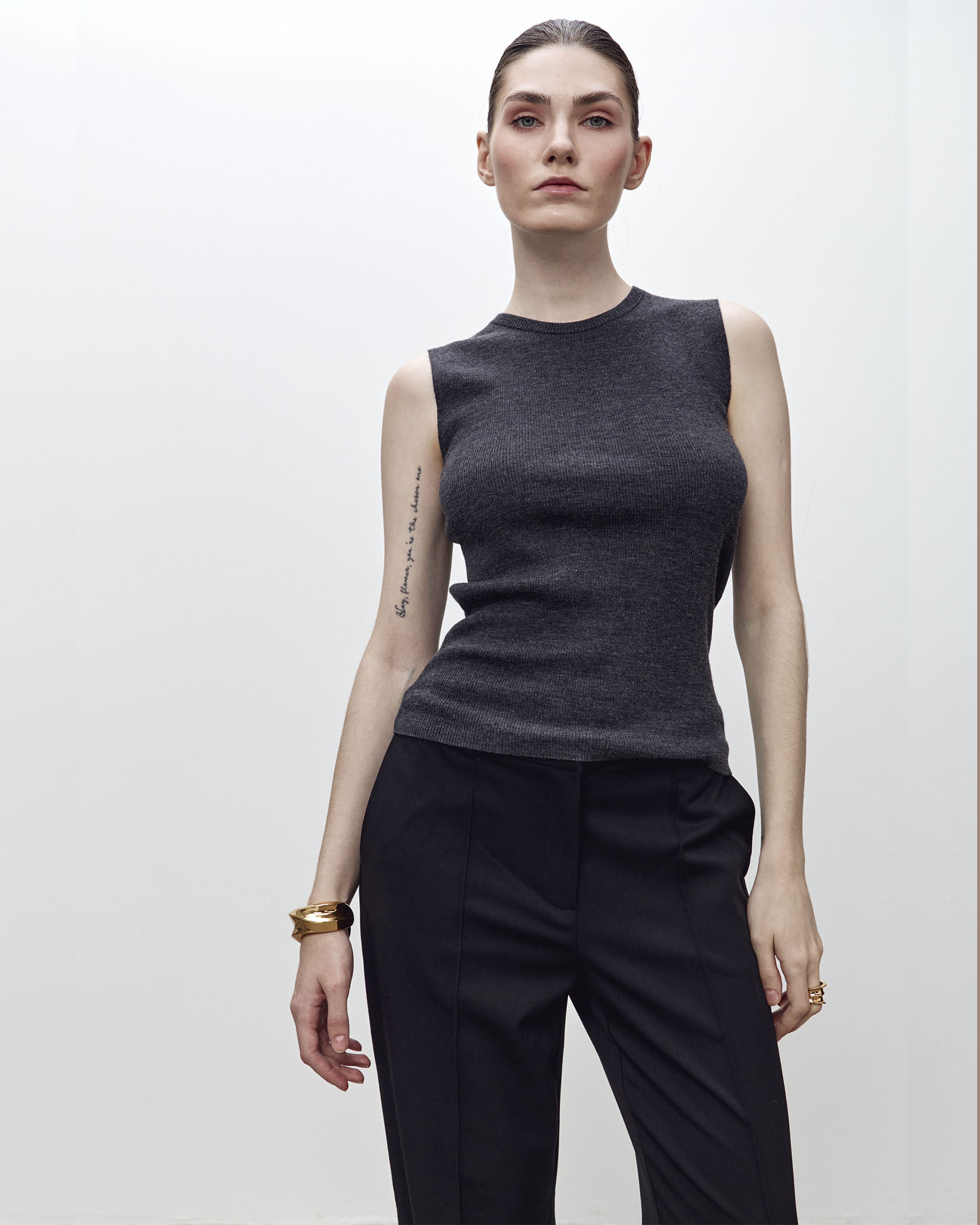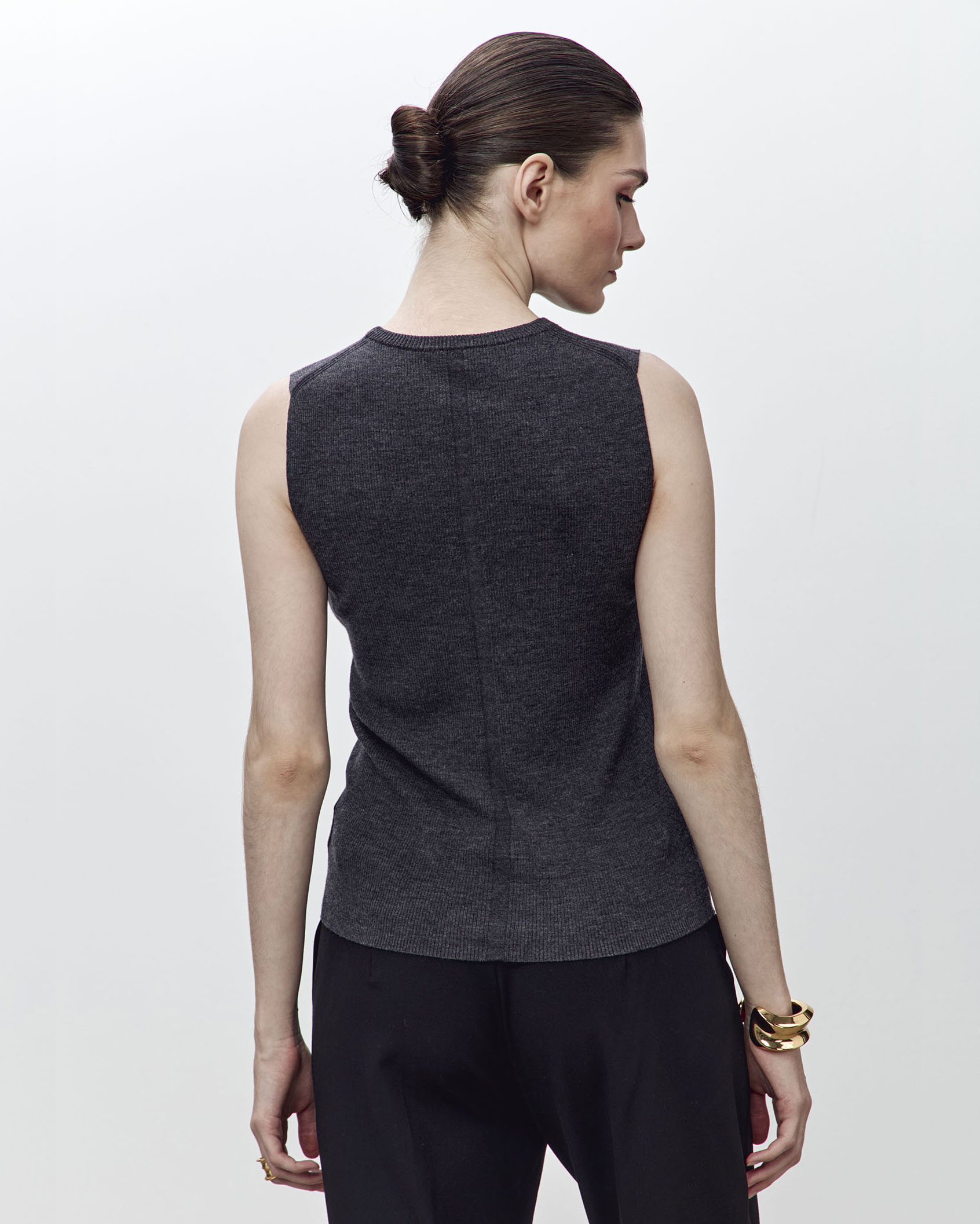 Безрукавка из тонкой высококачественной шерсти мериноса с декоративным элементом на спине. Вязаная текстура придает изделию интересный визуальный эффект, а эластичность ткани позволяет идеально облегать фигуру, создавая женственный силуэт.
