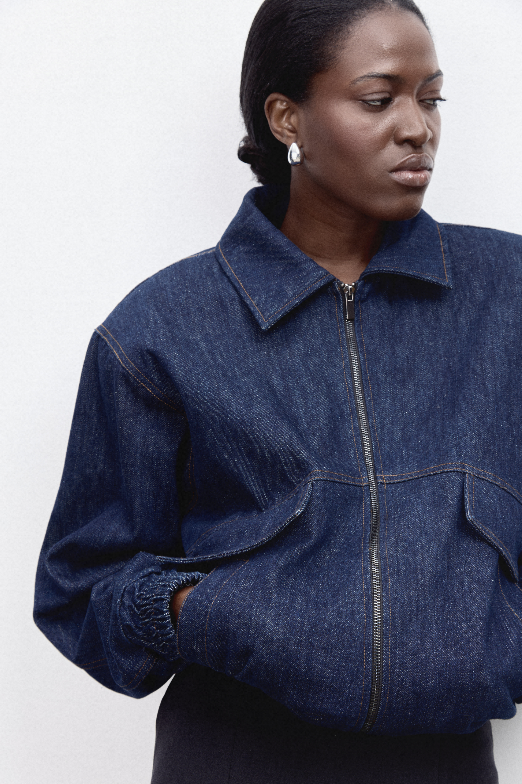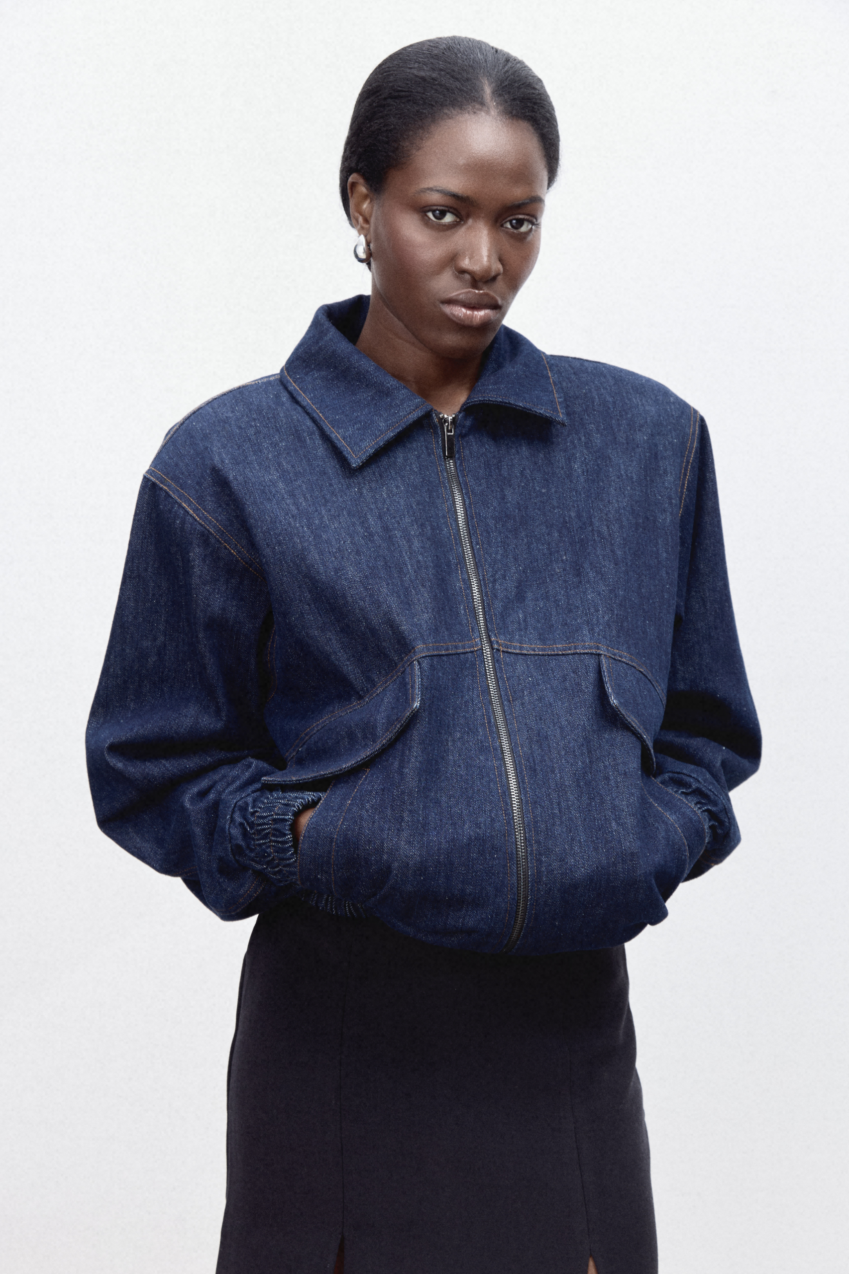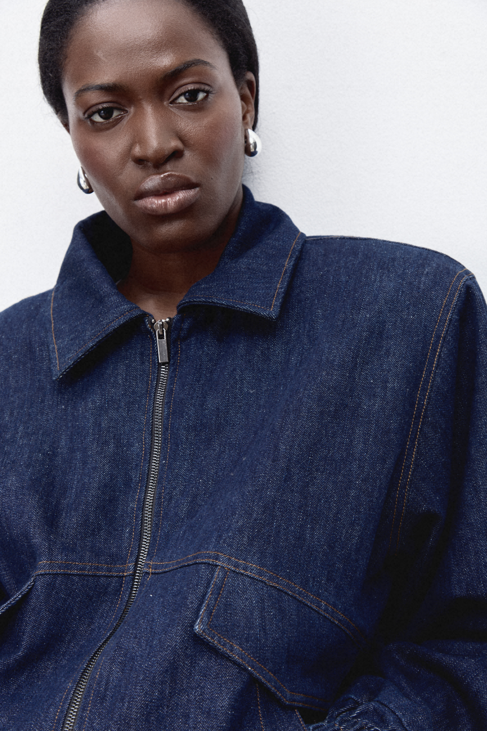 Бомбер глубокого синего оттенка свободного кроя из прочной джинсовой ткани из хлопка с черным подкладом и отложным воротником, функциональными и накладными карманами и плечевыми накладками на пуговицах внутри. Особый шик придает вышивка на спине. Отлично сочетается с джинсами Gabrielle
