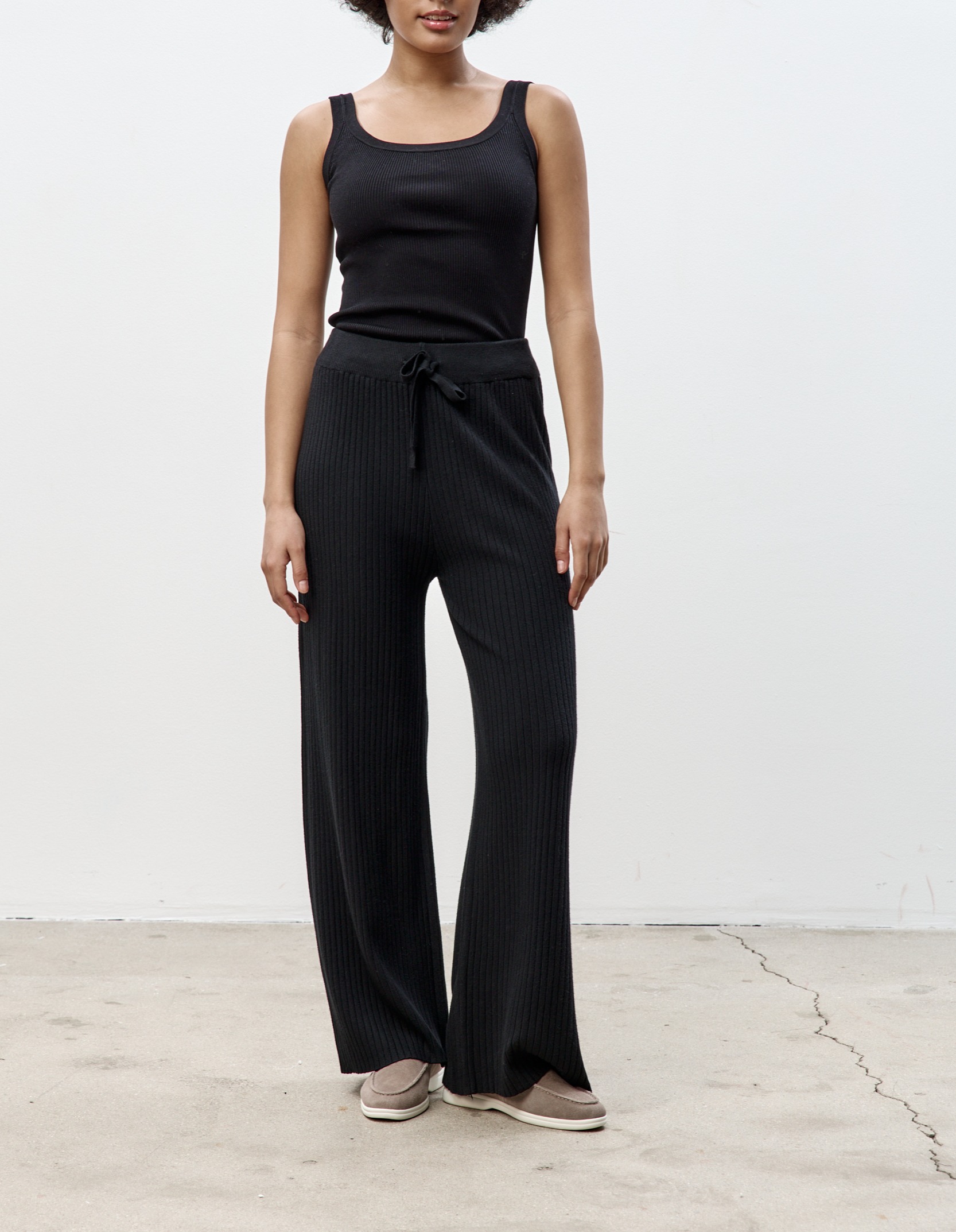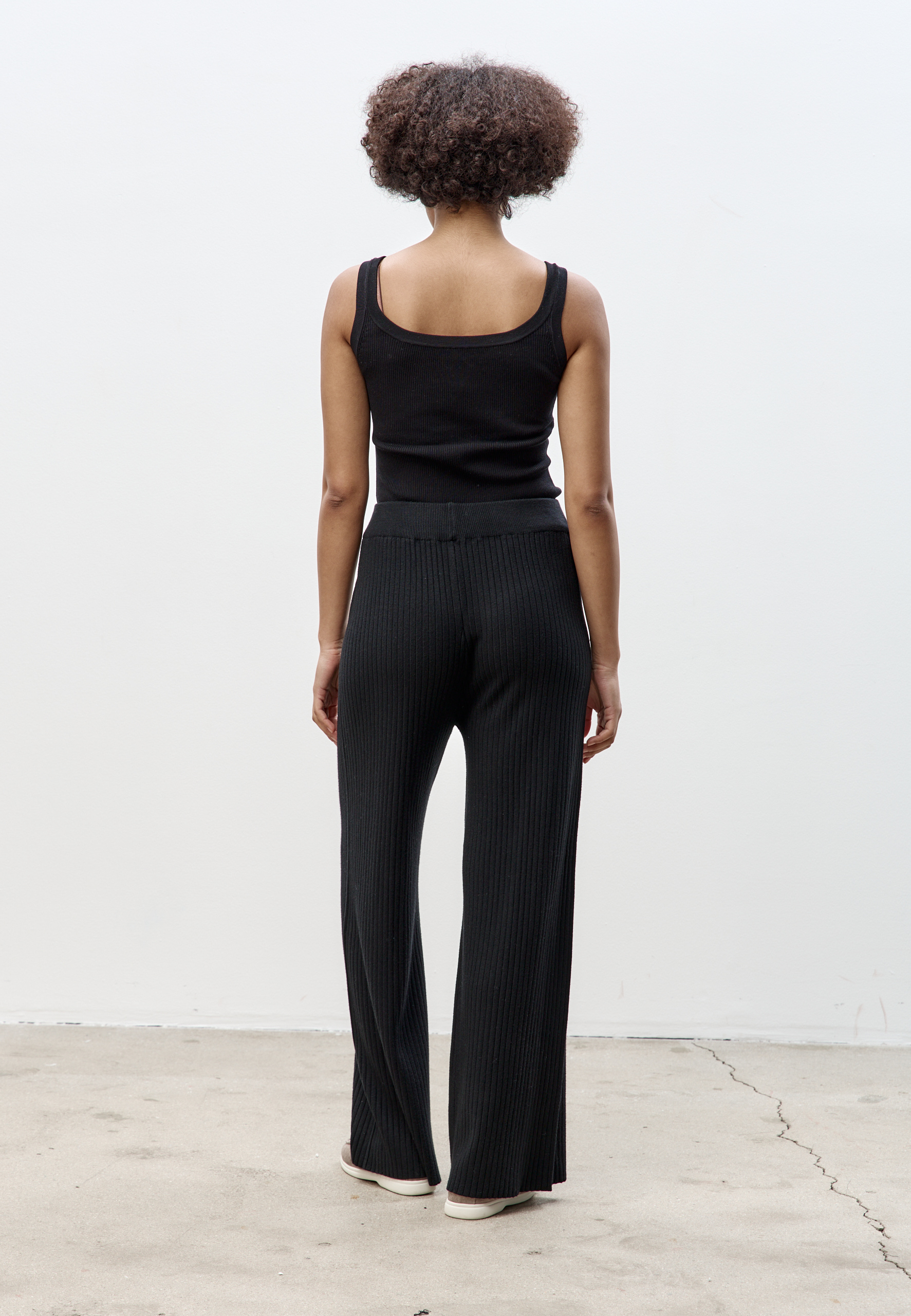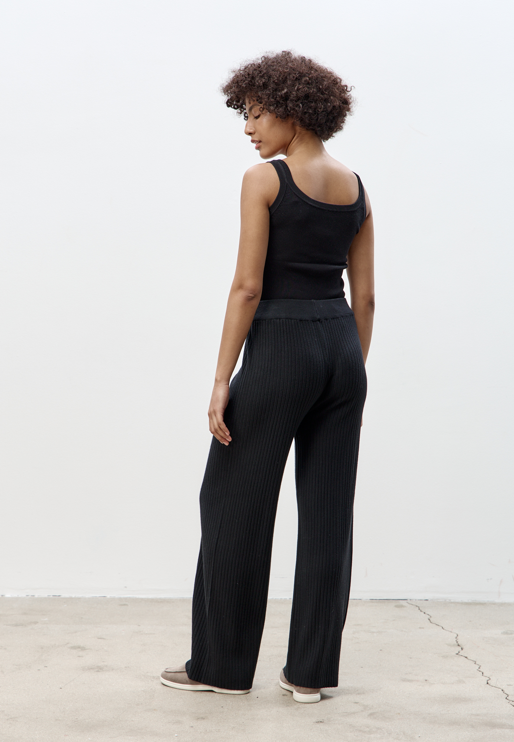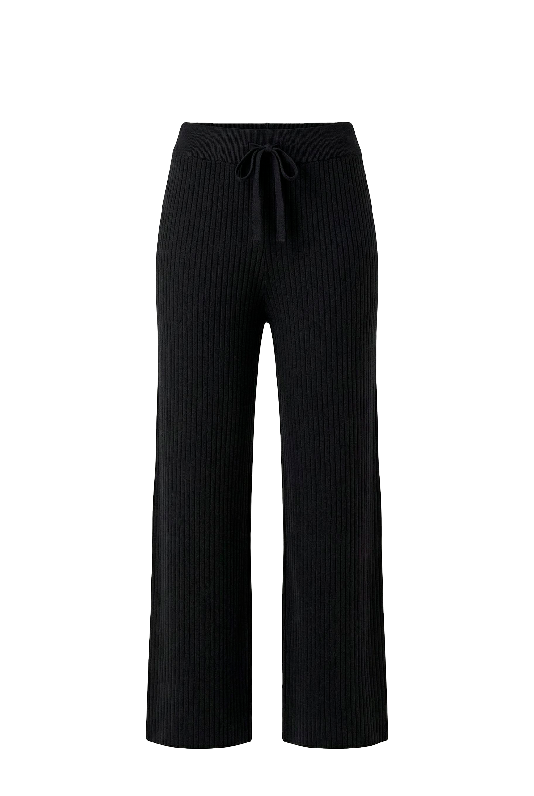 Брюки в рубчик из мягкого и эластичного трикотажа. Манжеты с завязками и эластичный пояс помогут отрегулировать посадку, сохраняют форму благодаря двойному переплетению. Брюки слегка укорочены, это позволяет носить их в сезон слякоти и снегопадов.