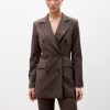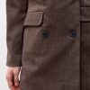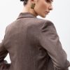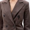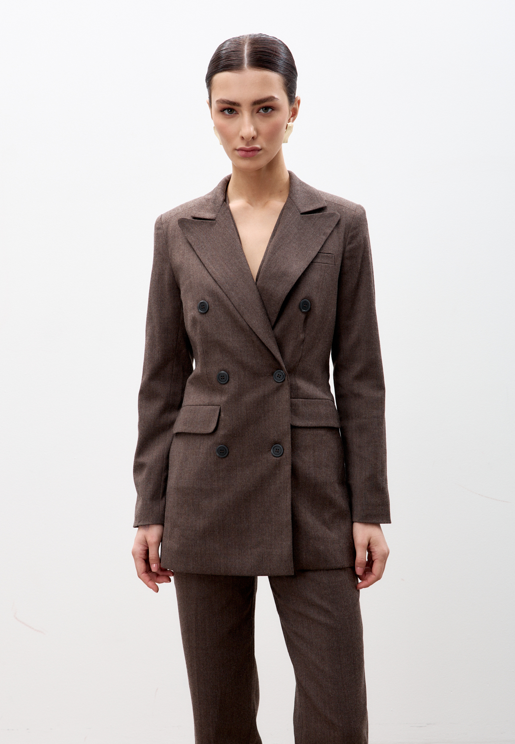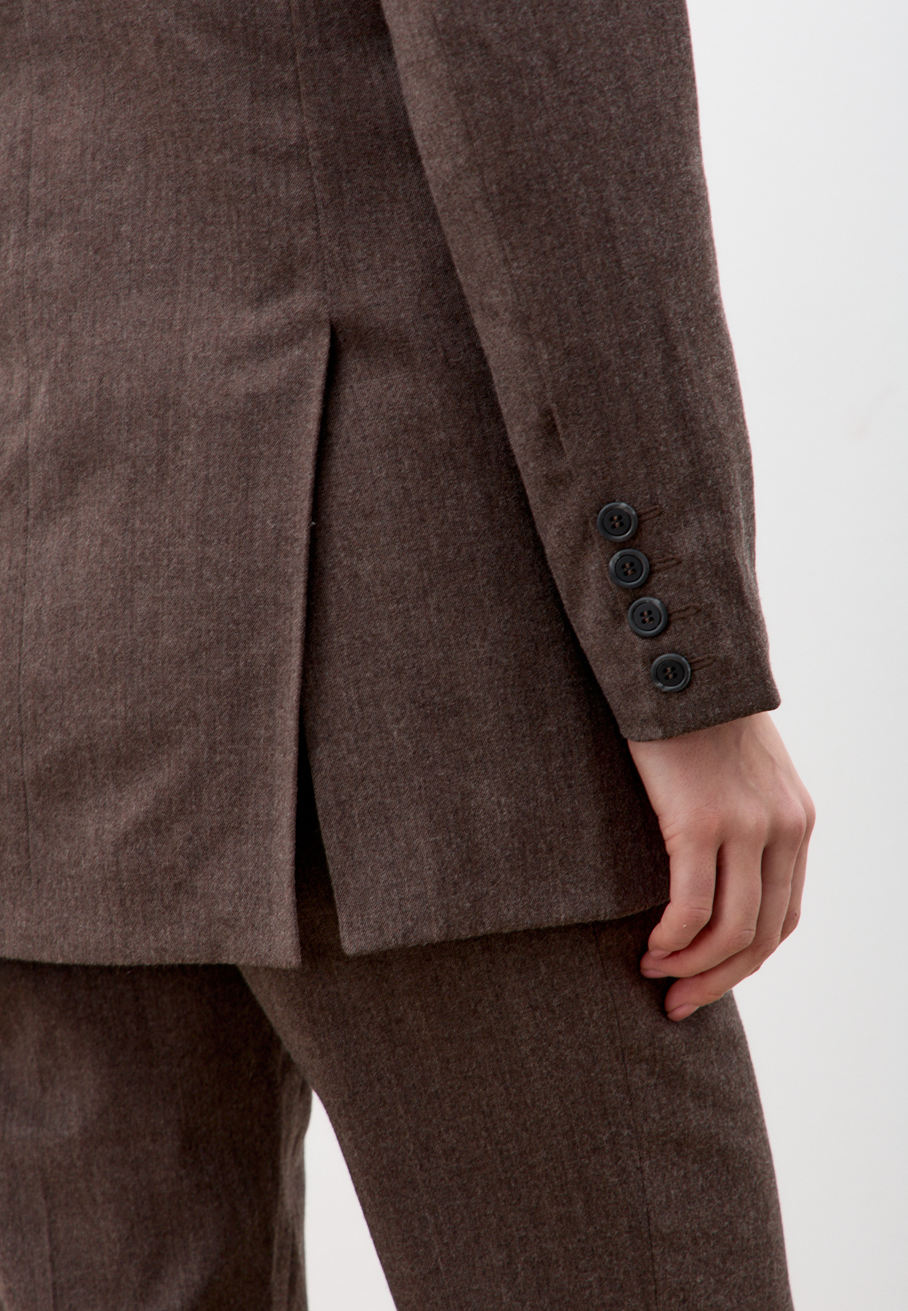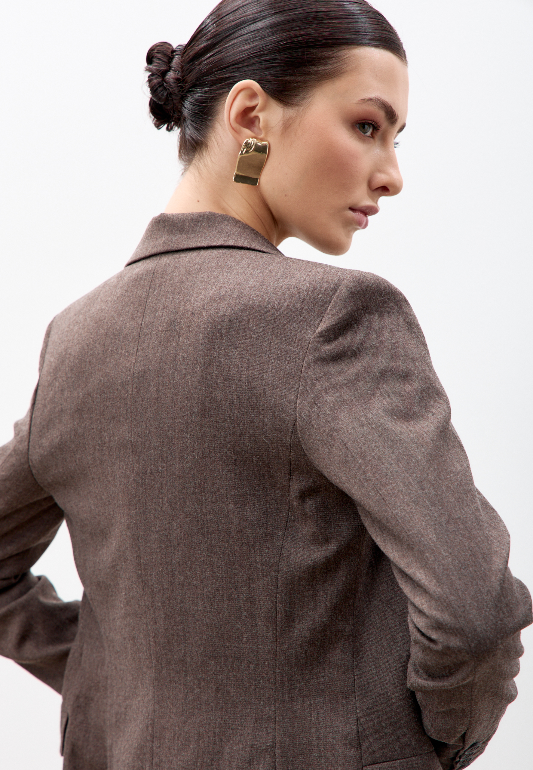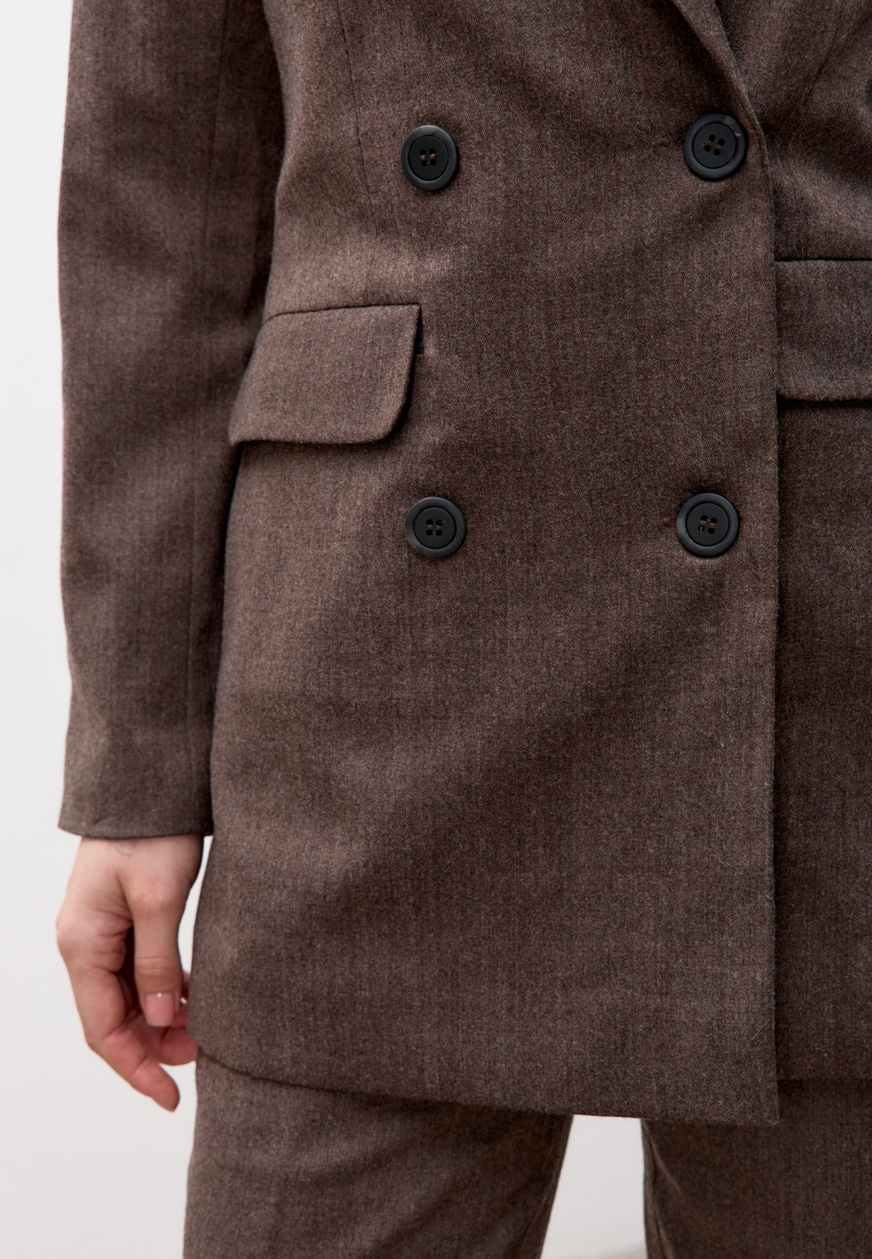 Пиджак в нейтральном оттенке, сшили в двубортном классическом крое, слегка приталив силуэт, что дополнительно усиливают акцентные плечи. Модель произвели из плотной костюмной ткани, основу которой составили шерстяная пряжа, чьи волокна создадут комфортный микроклимат, и полиэстеровые нити, укрепляющие материал. Оттенок ткани деликатно разбавляют пуговицы черепаховой расцветки, создавая ненавязчивый контраст.