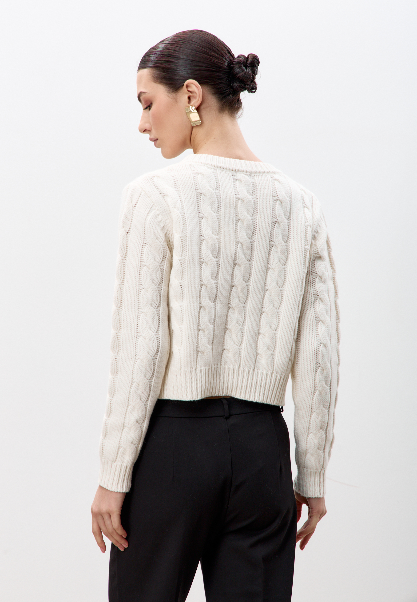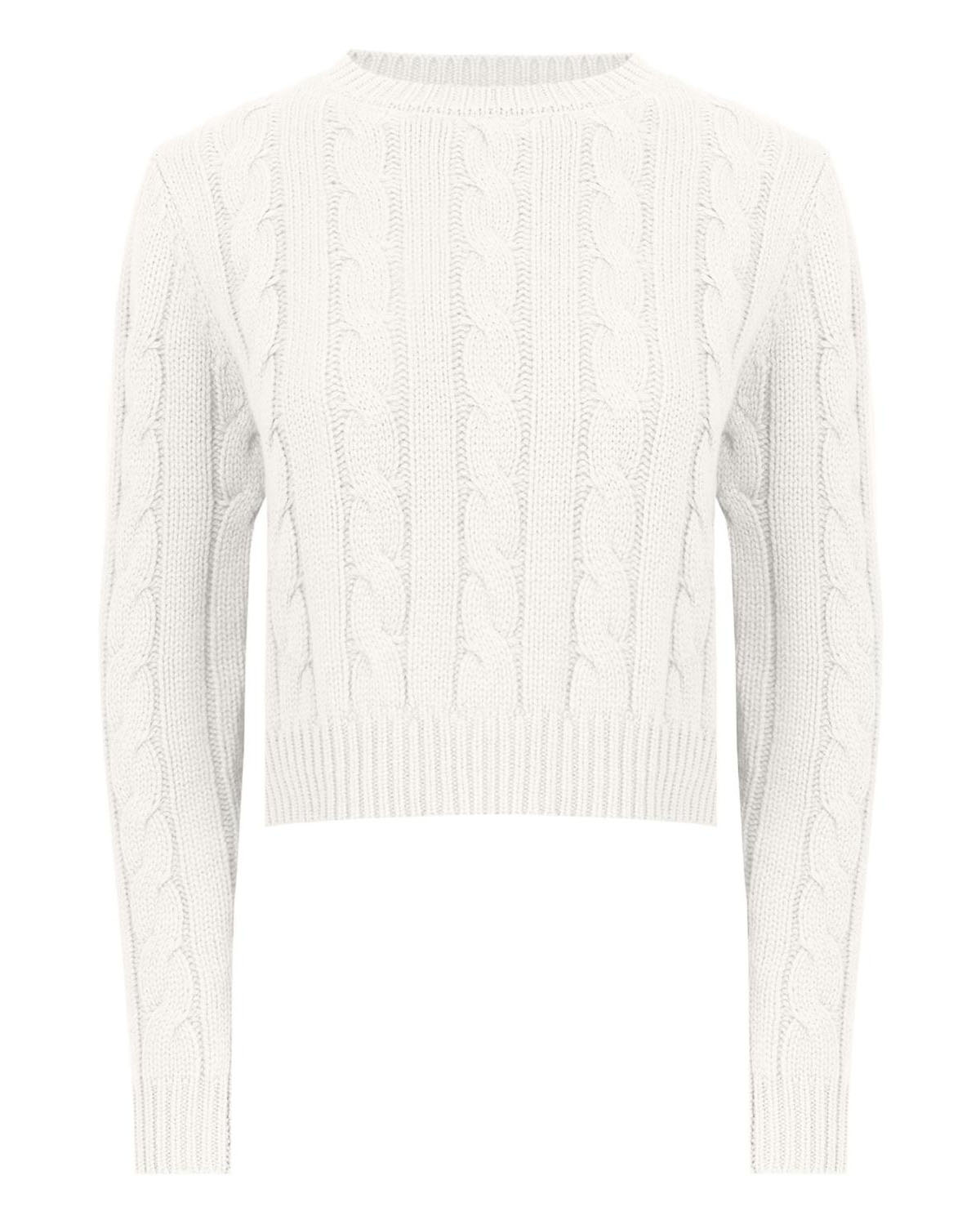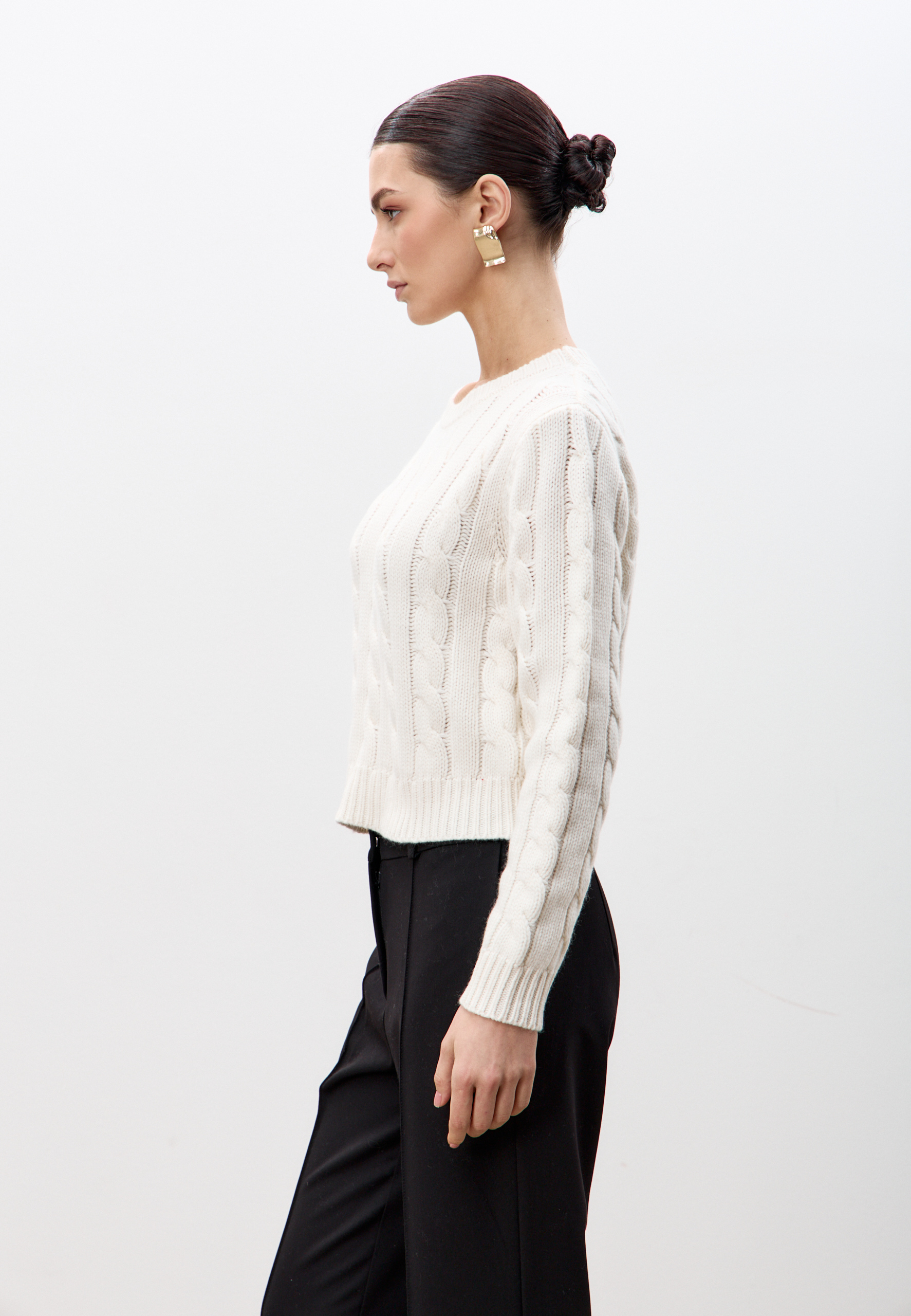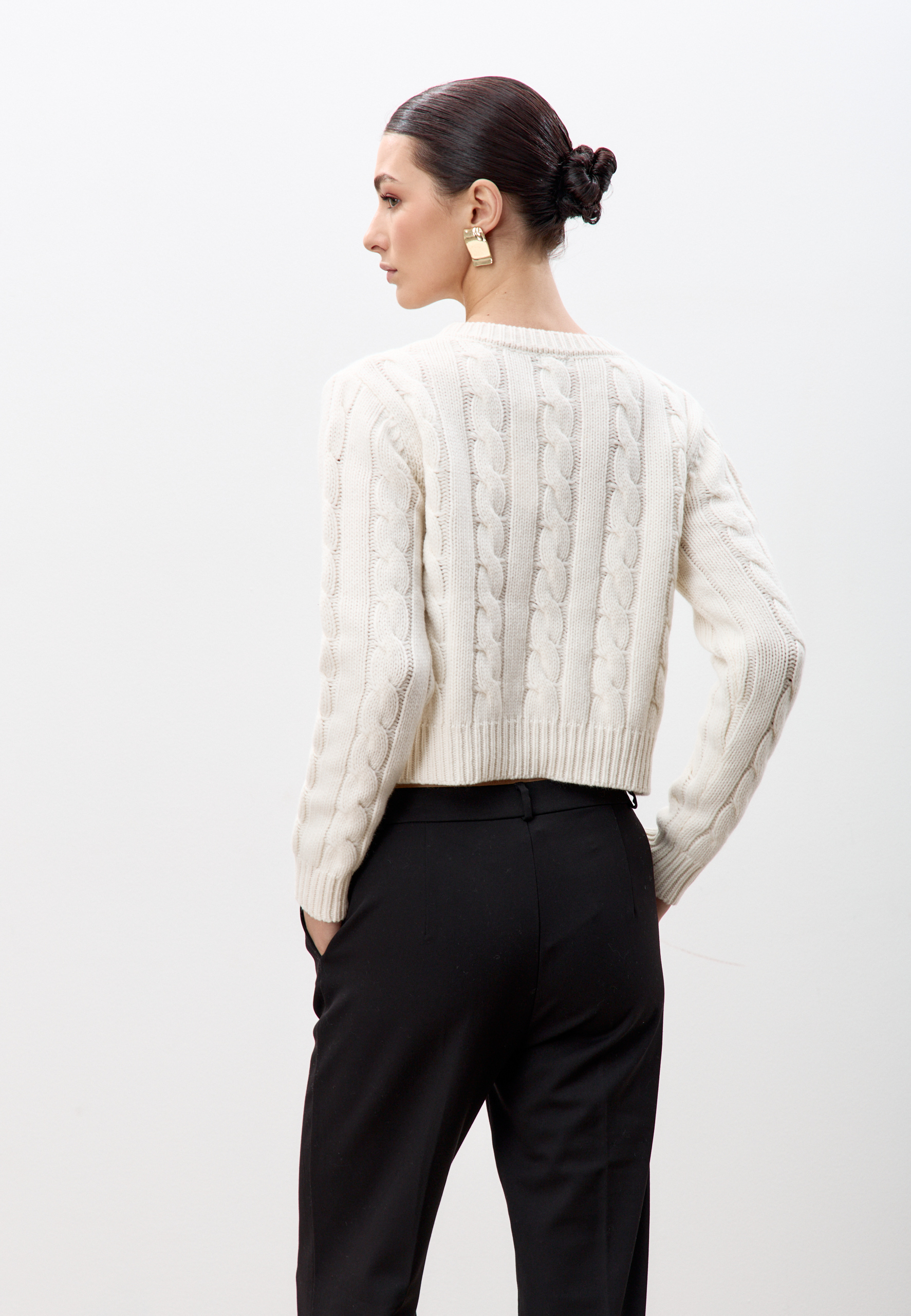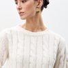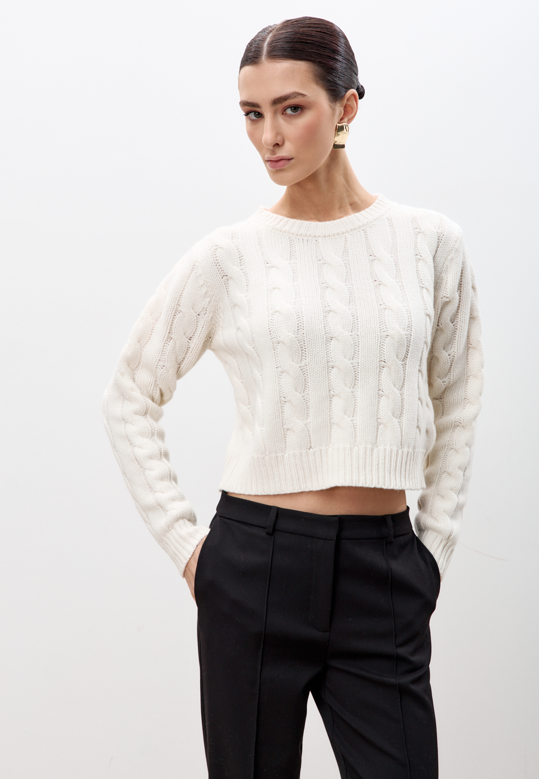 Свитер в оттенке серый шелк не будет перегревать в помещении за счет отсутствия высокого ворота и мягкого дышащего трикотажа. Основу составила шерсть, отобранная по тонкости и мягкости своих волокон, которые хорошо пропускают воздух, а для дополнительного телесного комфорта сырье очистили от раздражающих кожу волосков. Укороченную модель связали крупными косами, изысканно украсив сдержанный тон.