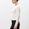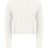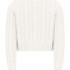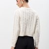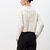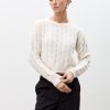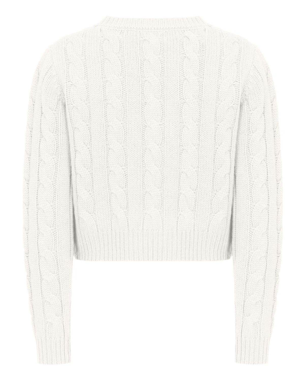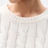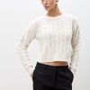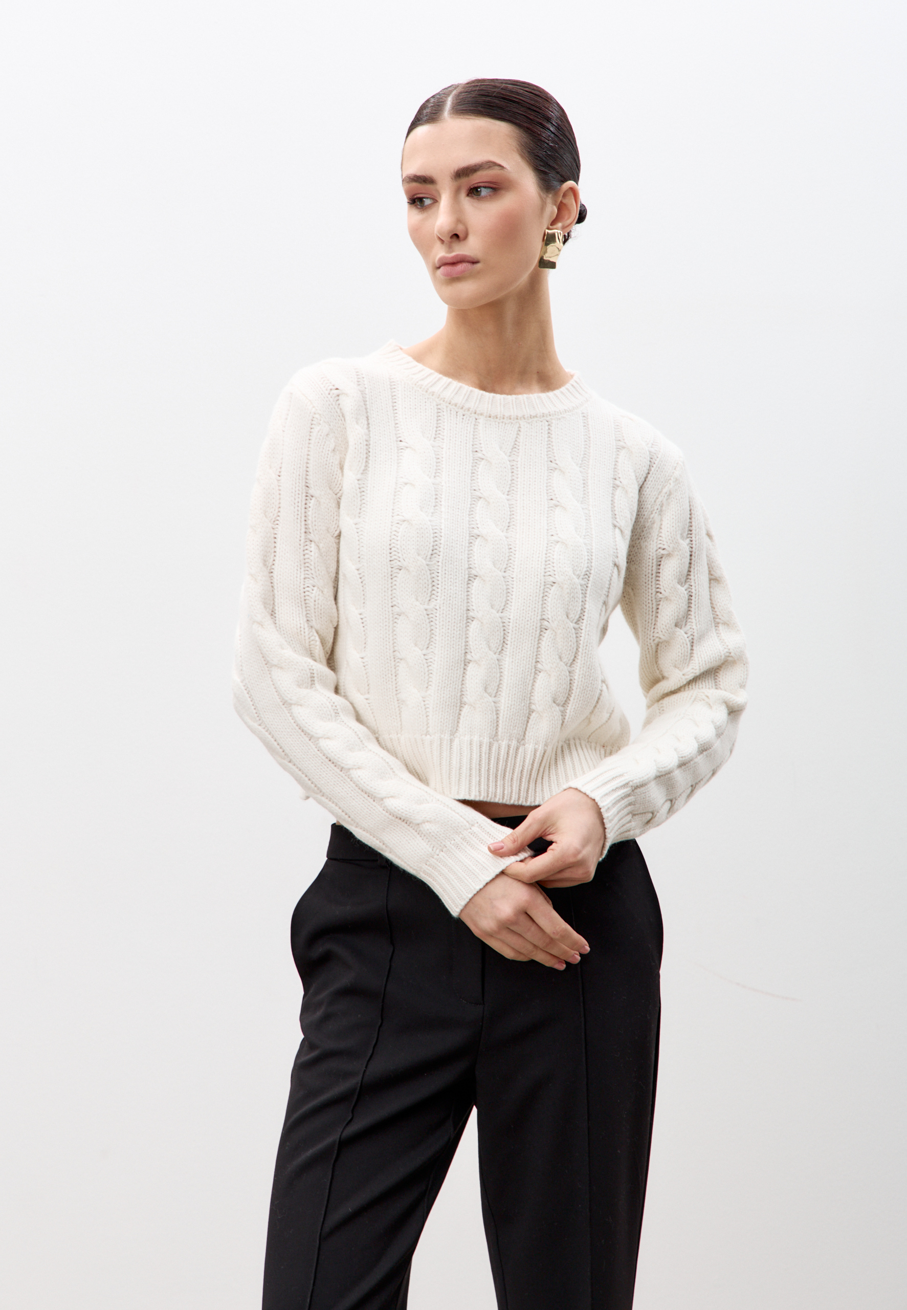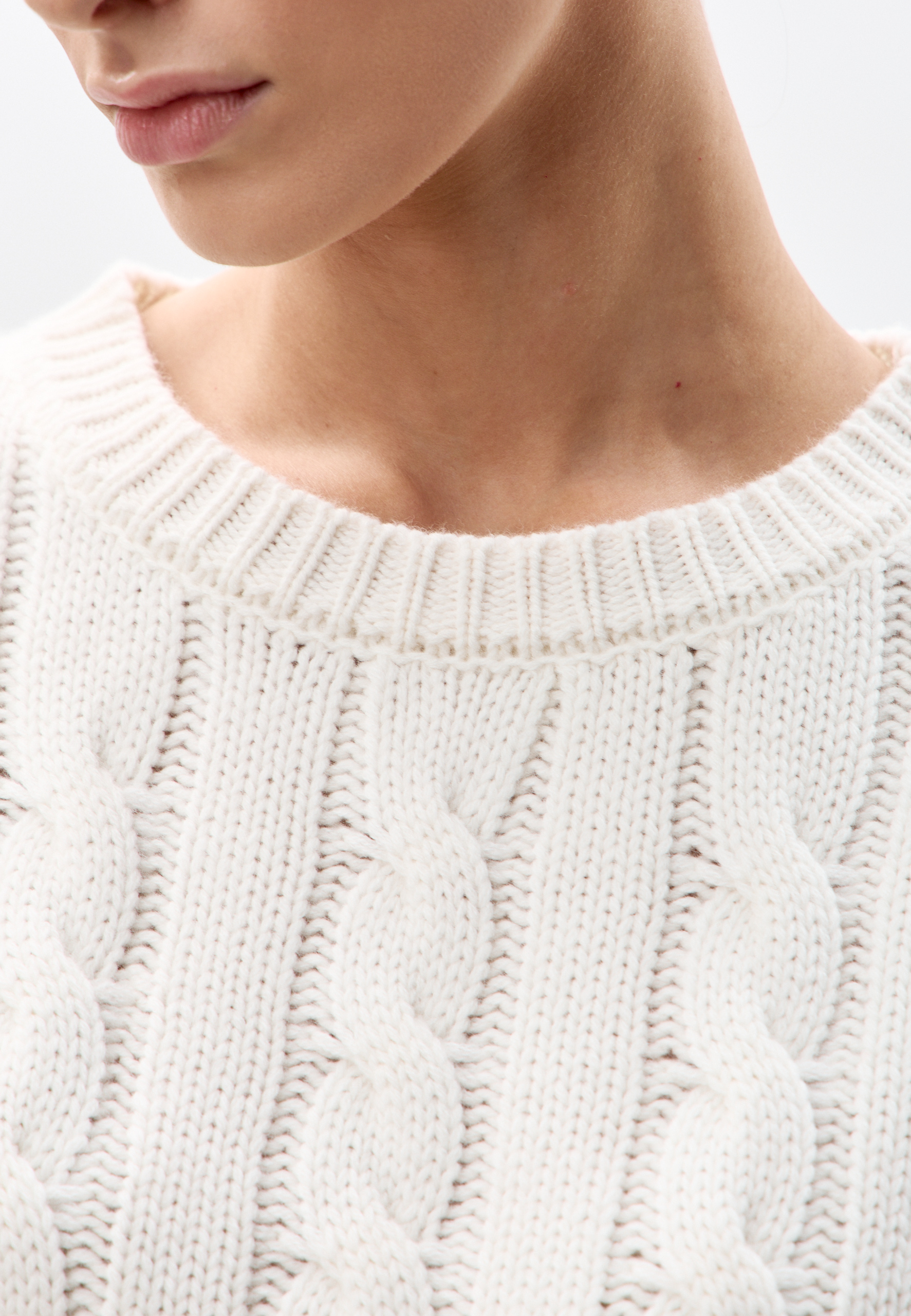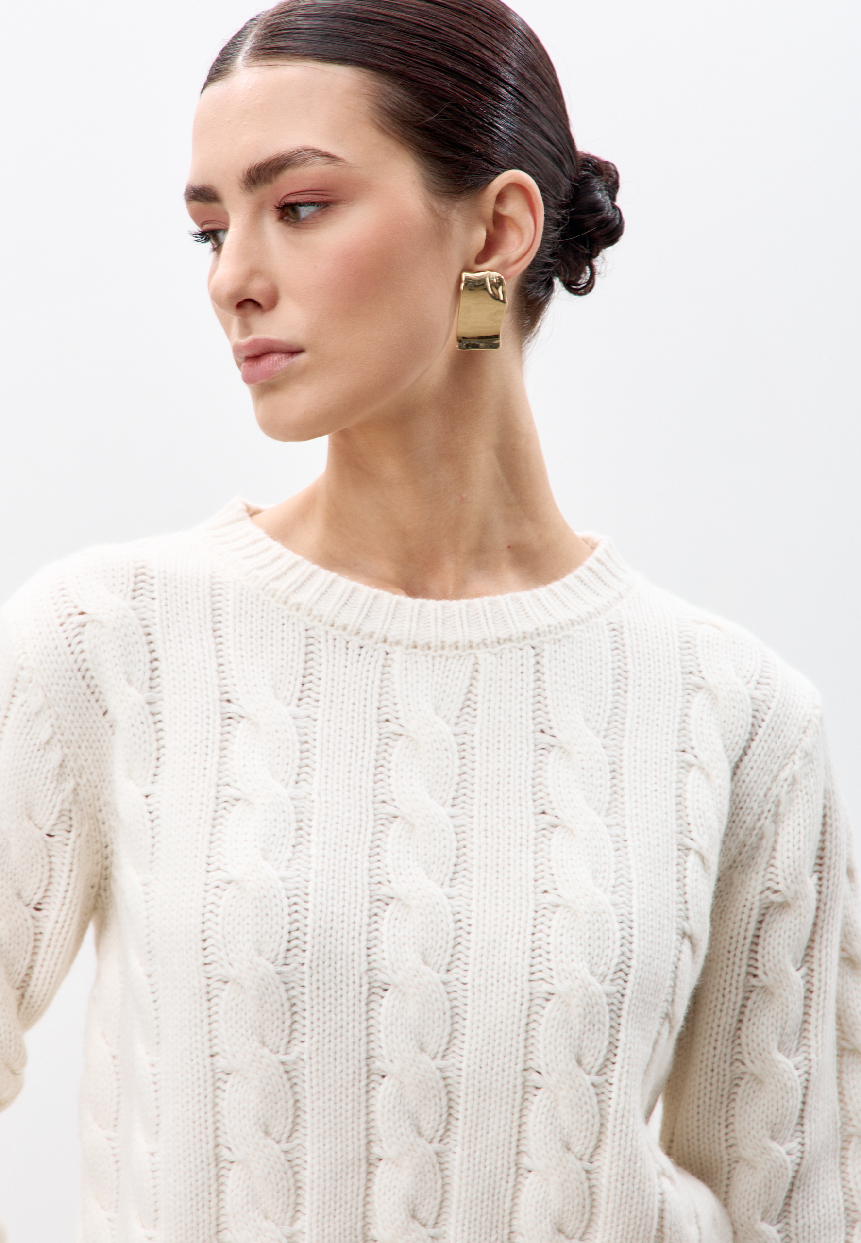 Свитер в оттенке серый шелк не будет перегревать в помещении за счет отсутствия высокого ворота и мягкого дышащего трикотажа. Основу составила шерсть, отобранная по тонкости и мягкости своих волокон, которые хорошо пропускают воздух, а для дополнительного телесного комфорта сырье очистили от раздражающих кожу волосков. Укороченную модель связали крупными косами, изысканно украсив сдержанный тон.