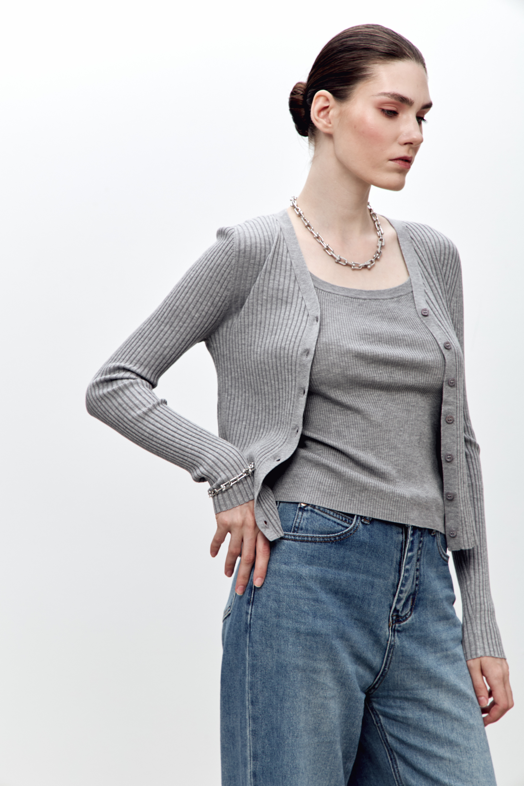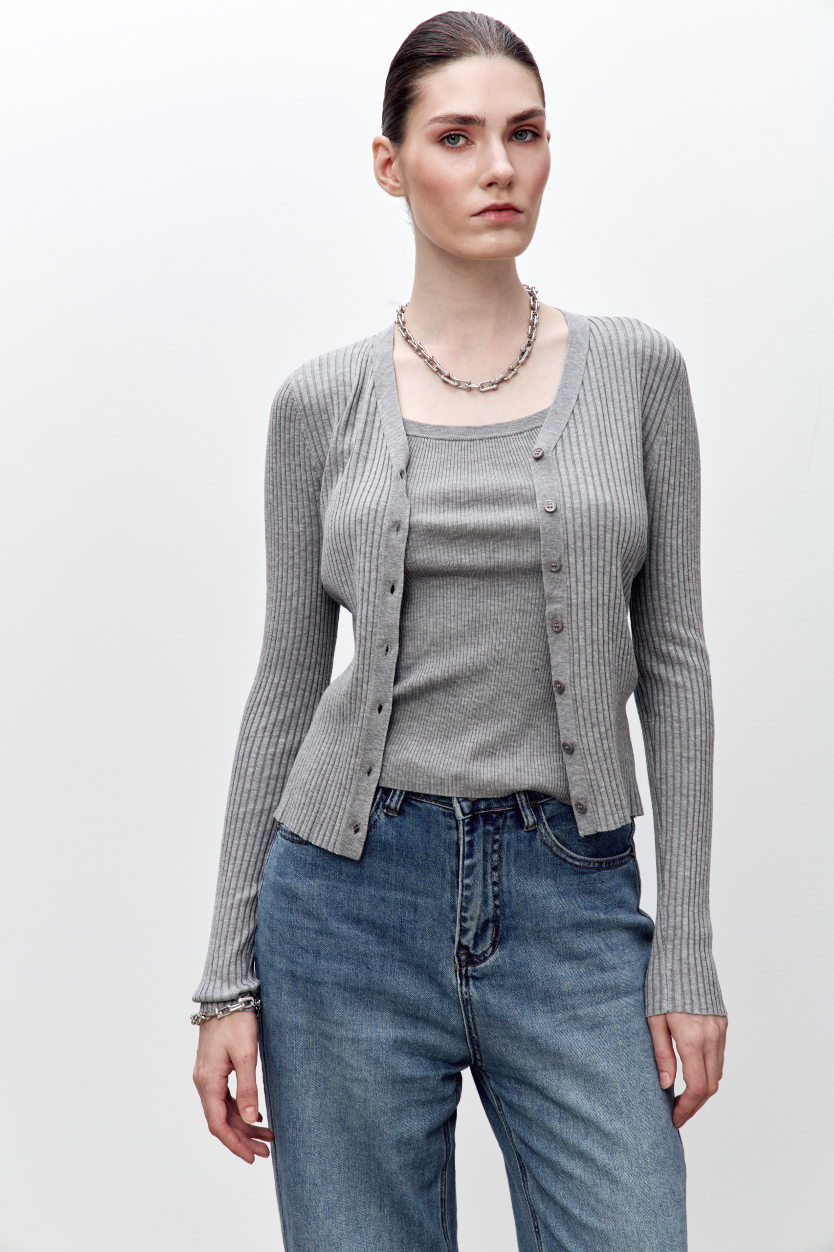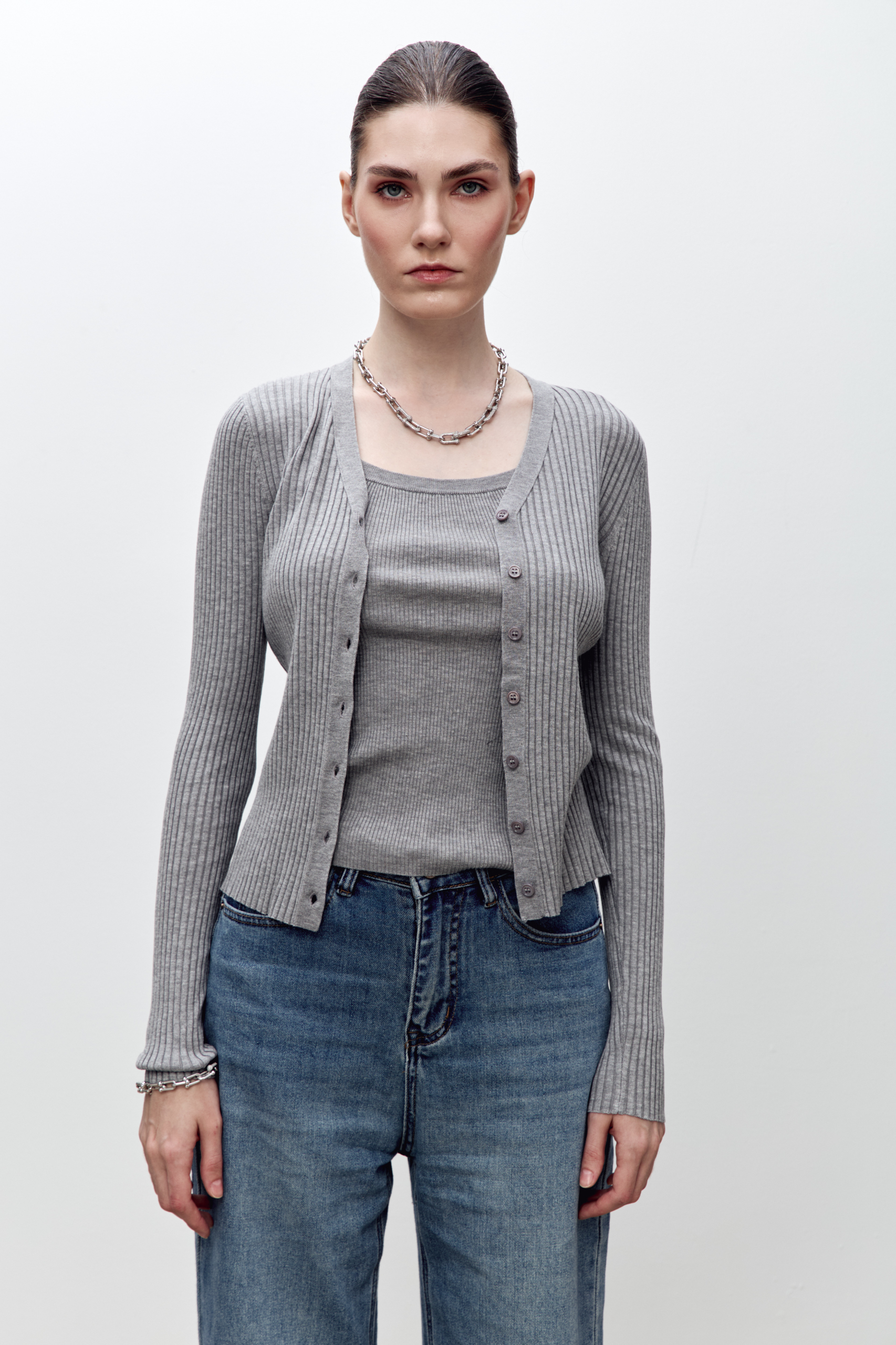 Кардиган из плотного трикотажного полотна. Вязаная текстура придает изделию интересный визуальный эффект, а эластичность ткани позволяет идеально облегать фигуру, создавая женственный силуэт. Идеально сочетается с майкой в тон.