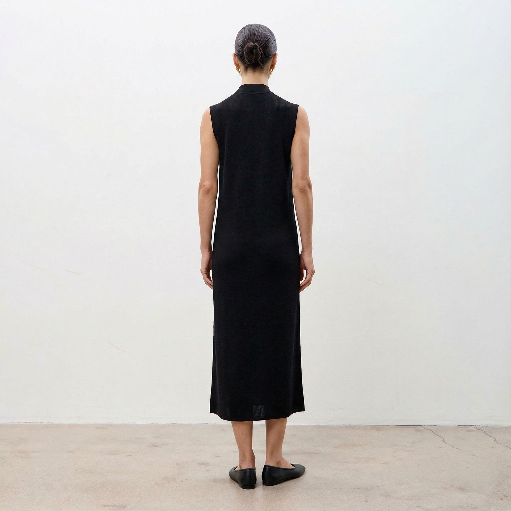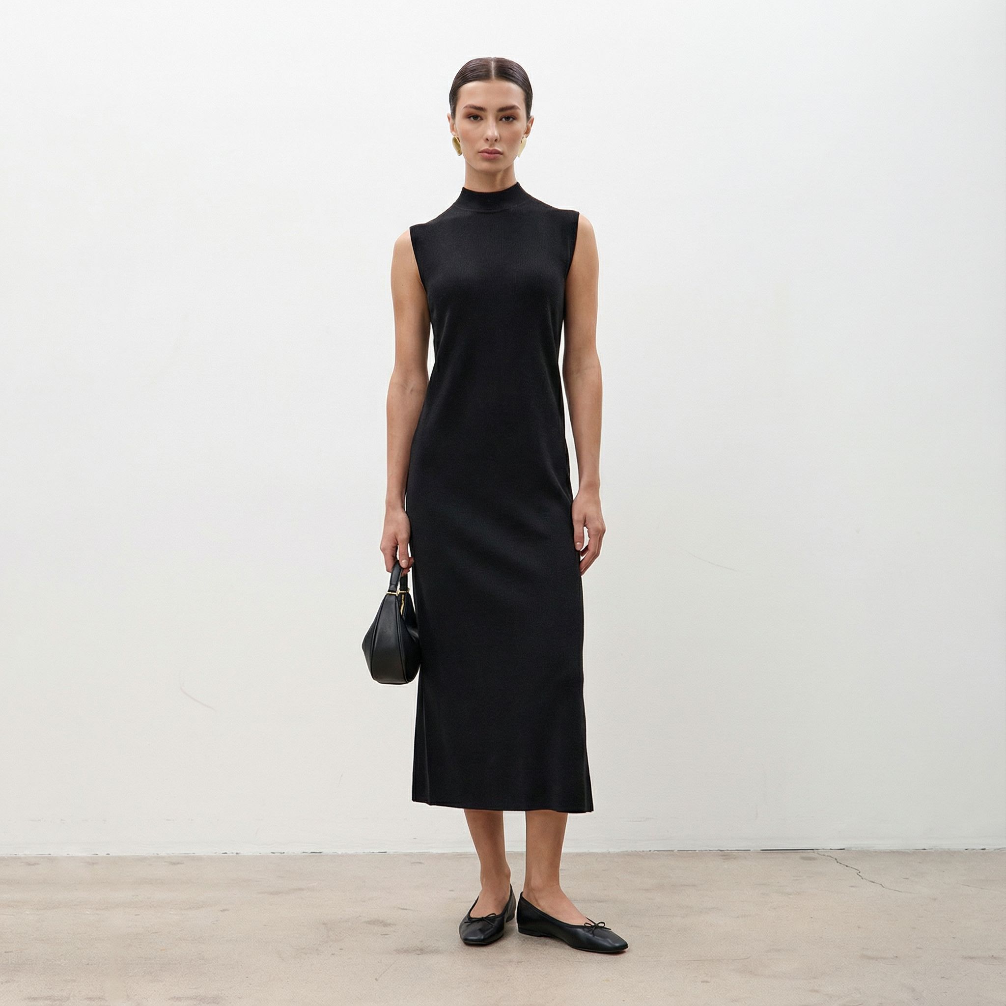 Платье длины макси в оттенке мокко, декорировано высоким воротом и разрезом по левому краю подола. Изготовлено из плотного фактурного трикотажа, который хорошо тянется, практически не мнётся и приятно ощущается на теле.