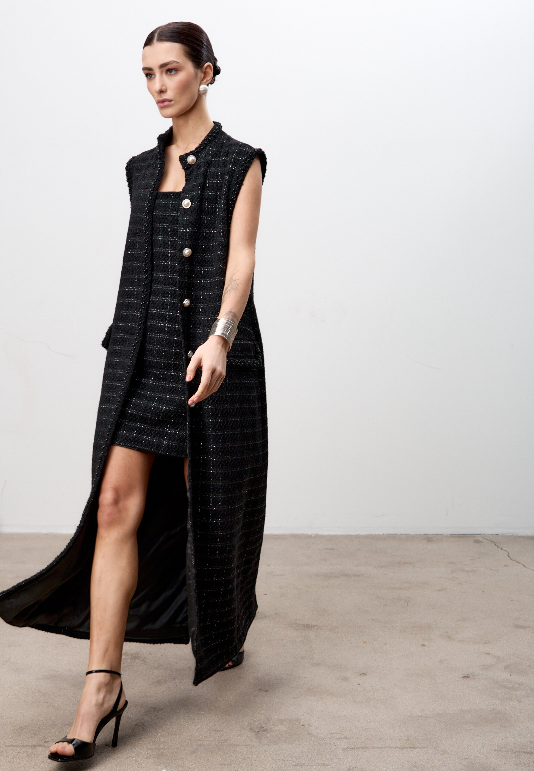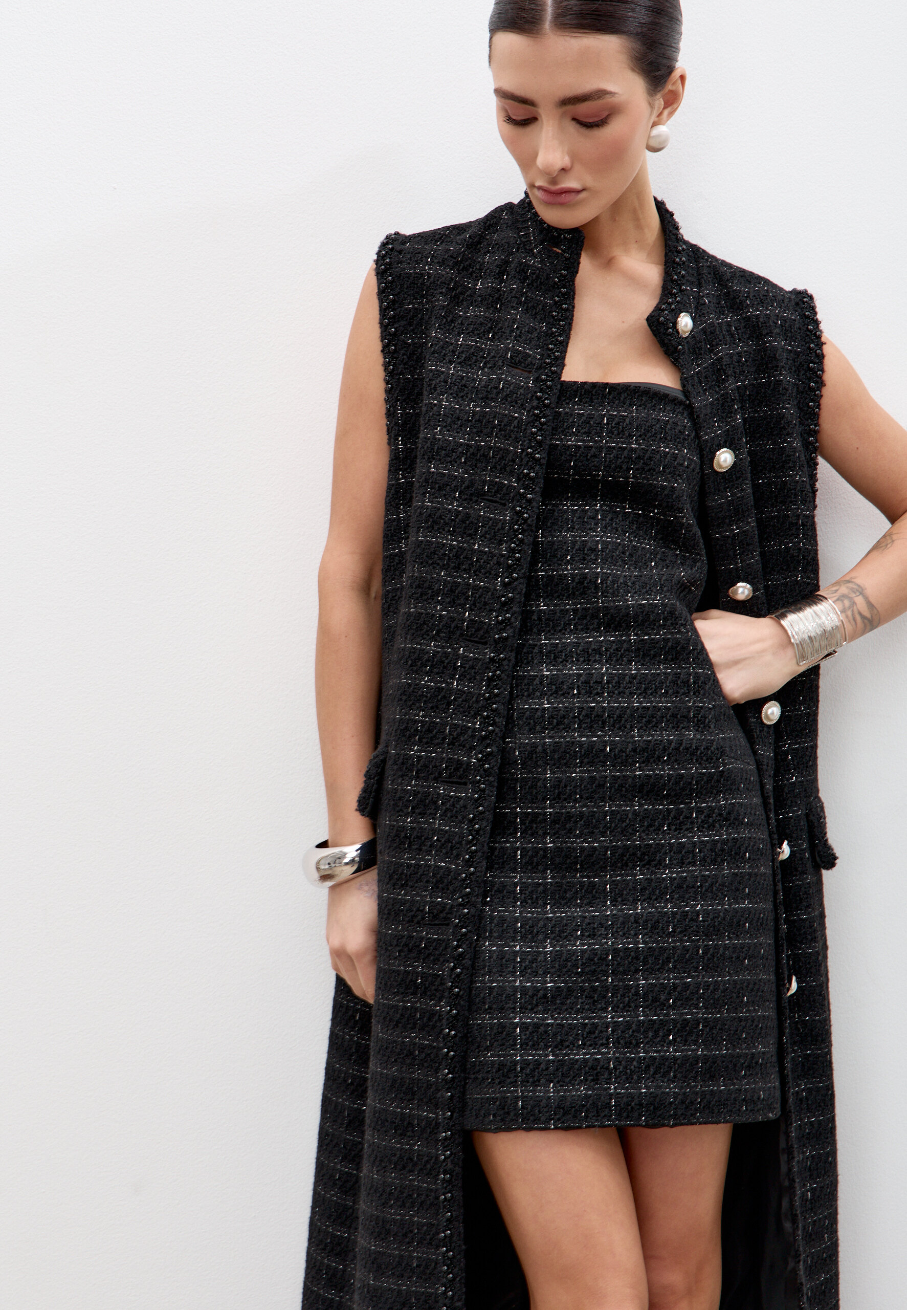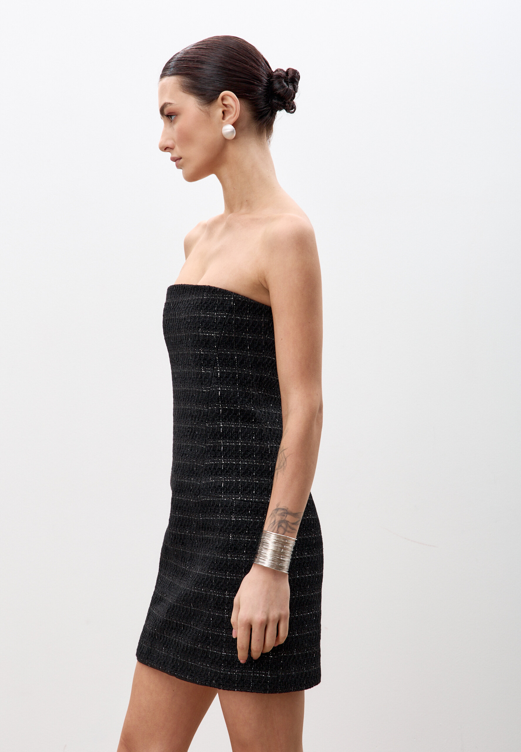 Платье-мини по фигуре на подкладке, выполненное из премиальной ткани высокого качества с добавлением золотой нити. Изысканное и комфортное платье для выхода в свет.