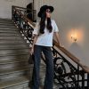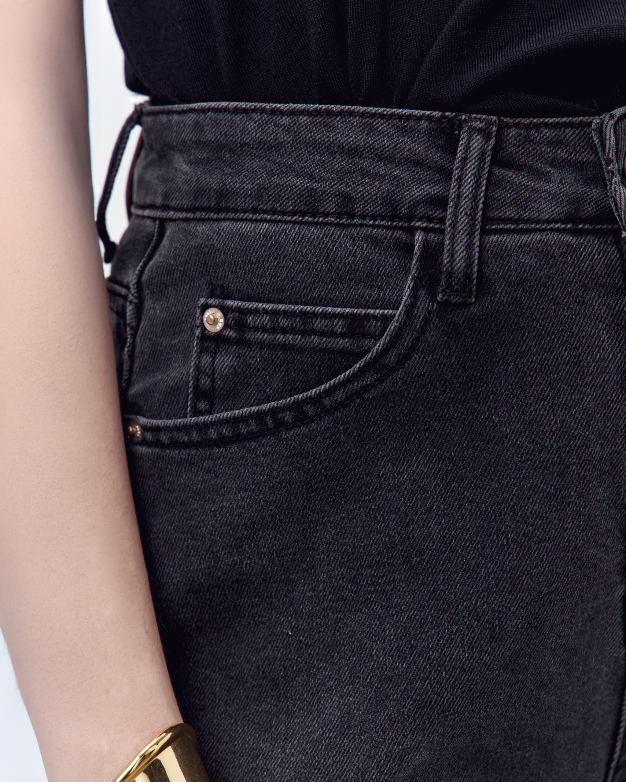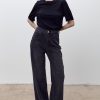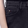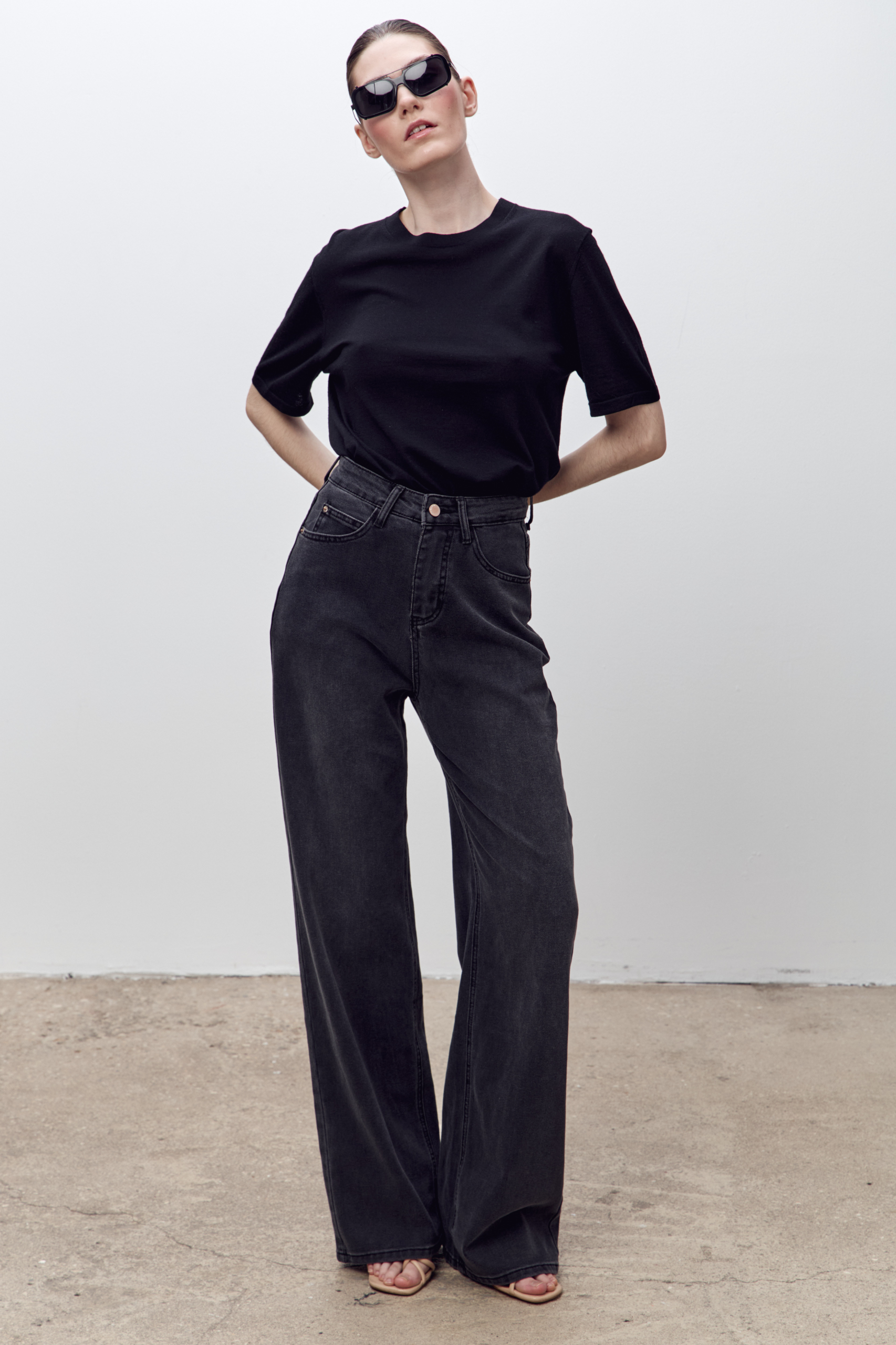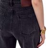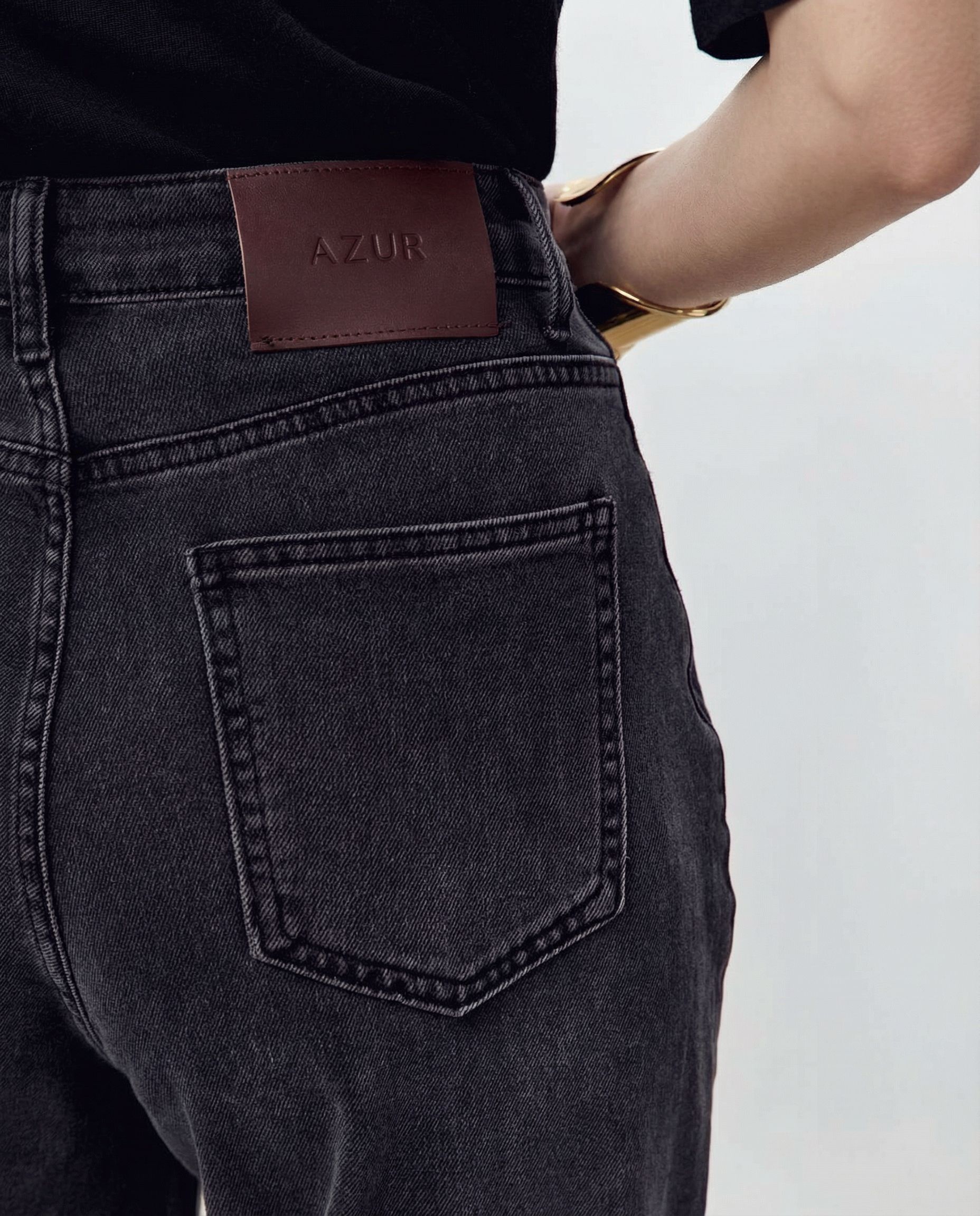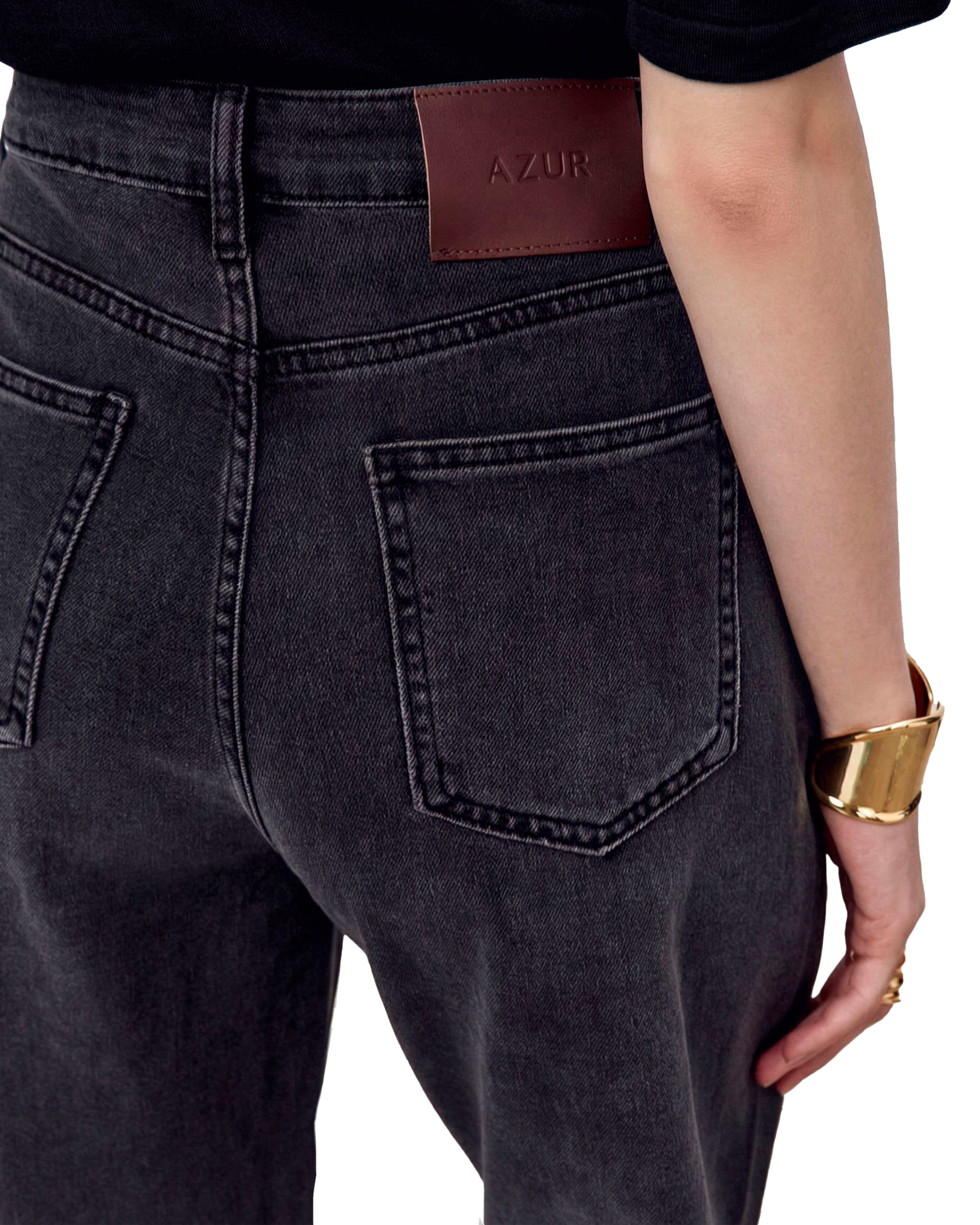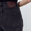 Джинсы на высокой посадке с пятью карманами и с кожаным патчем.