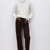 Джинсы на высокой посадке с пятью карманами и с кожаным патчем.