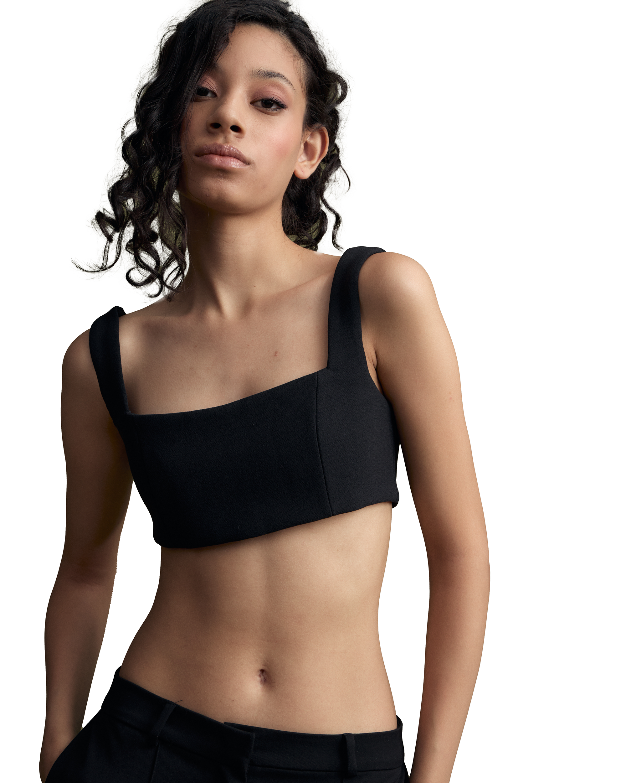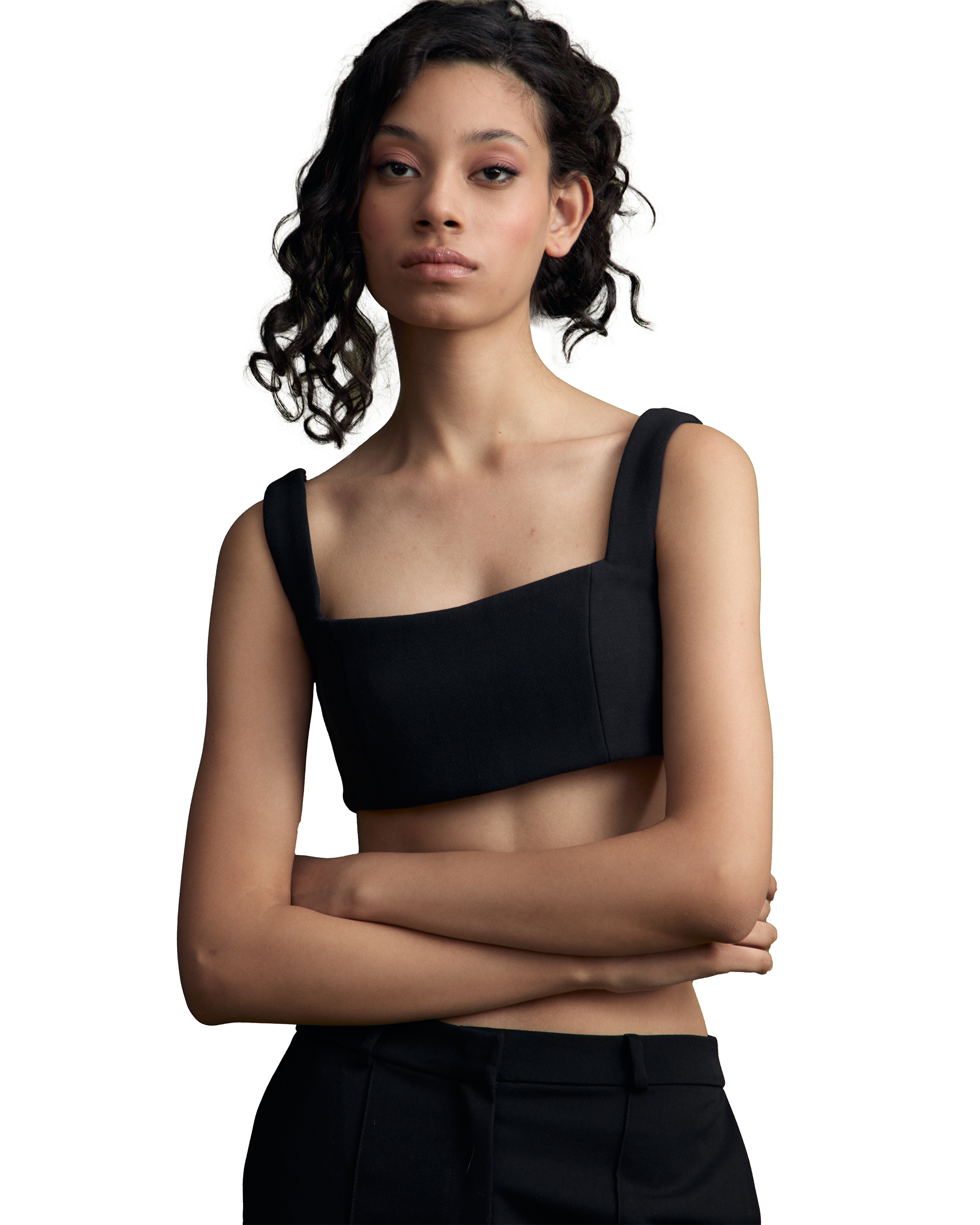 Короткий топ из нежной вискозы. Плотно фиксируется на теле, благодаря застежке на молнии и широких бретелях.