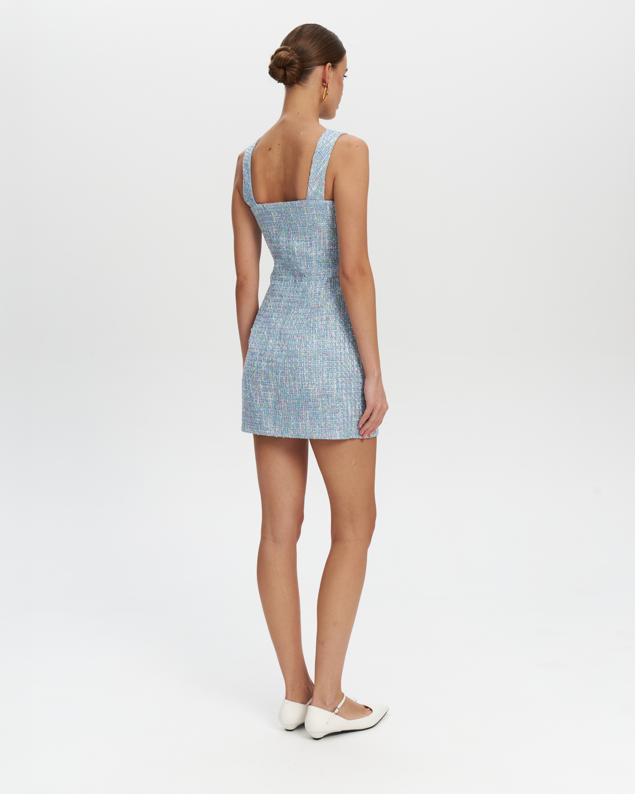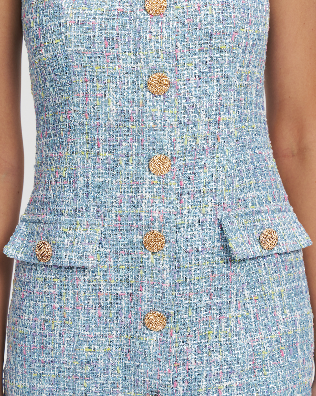 Приталенный мини-сарафан из фактурного твида. Декоративные карманы и акцентные пуговицы. Молния сзади и декоративные карманы.