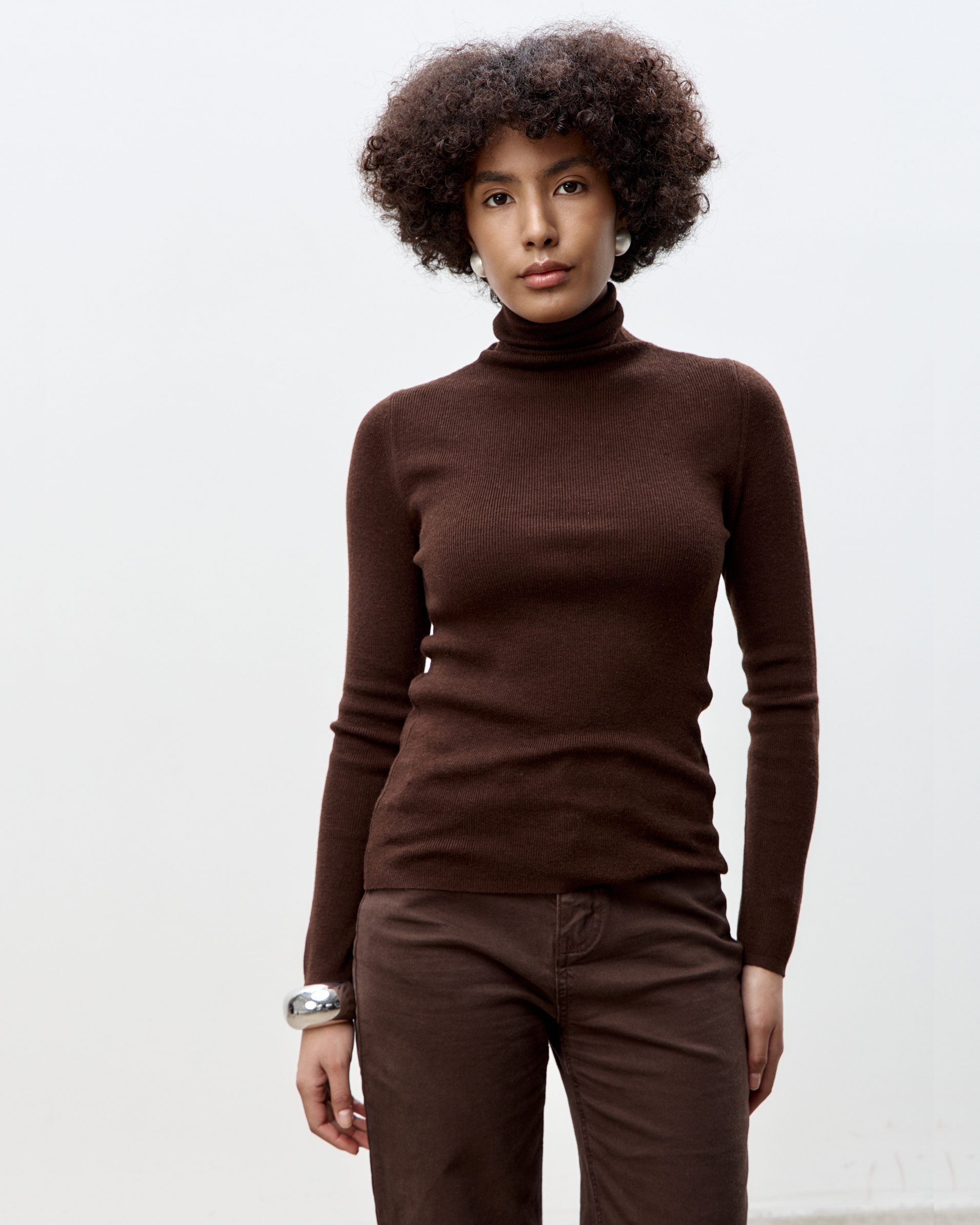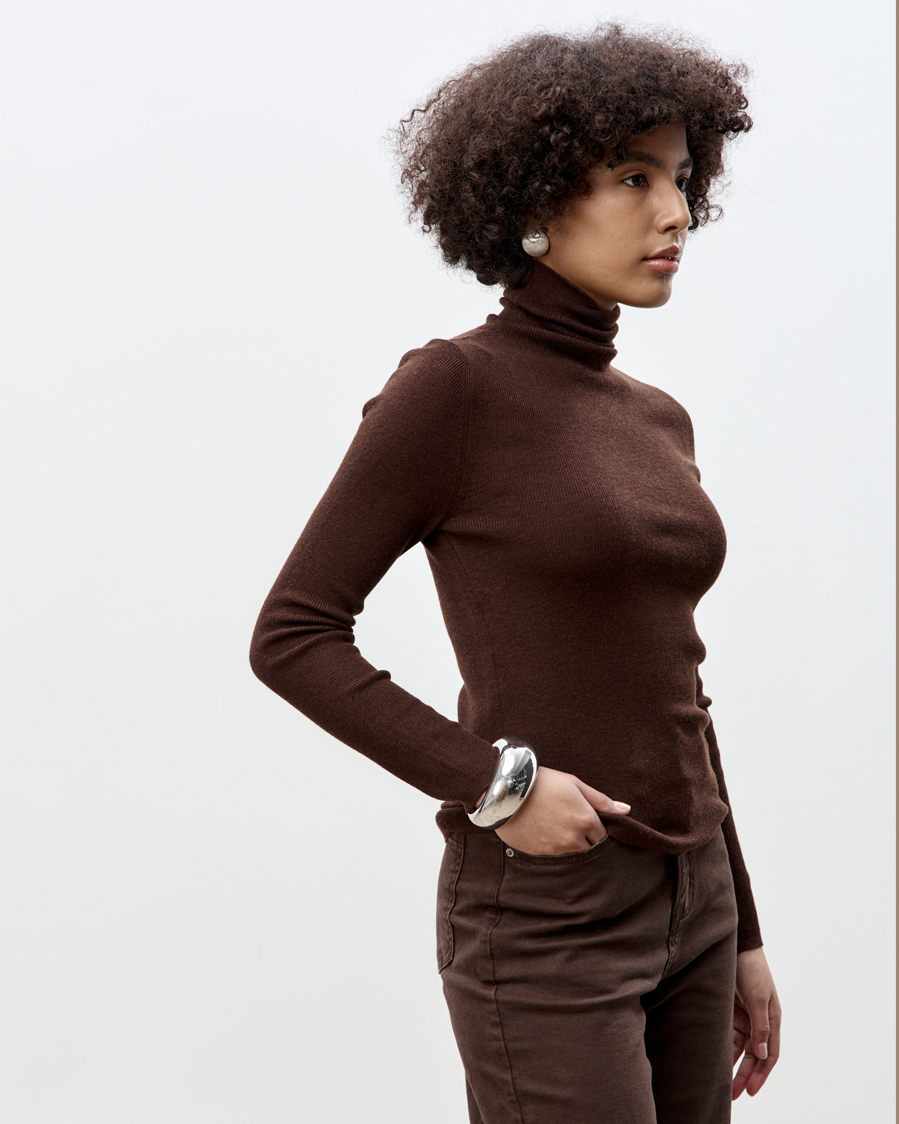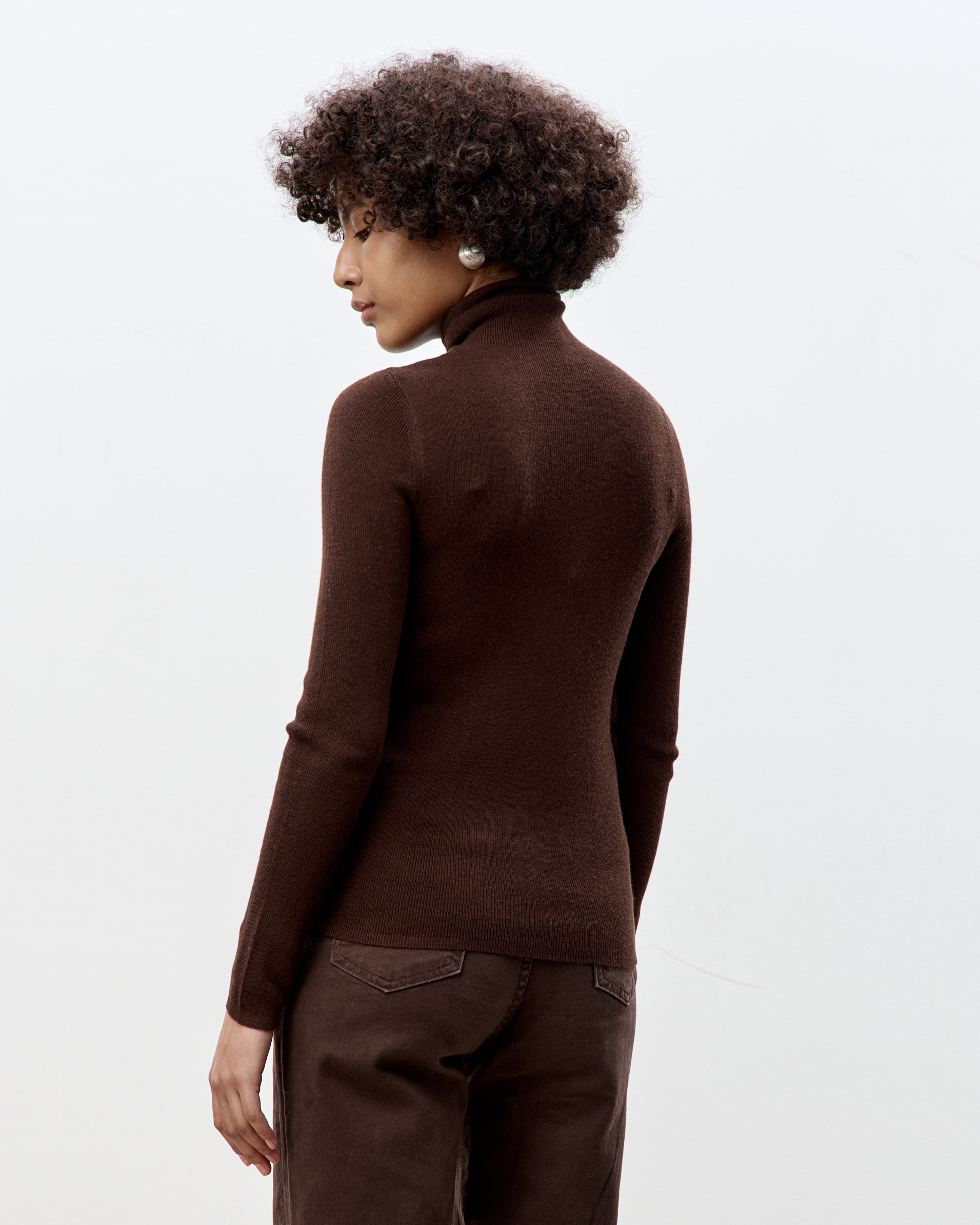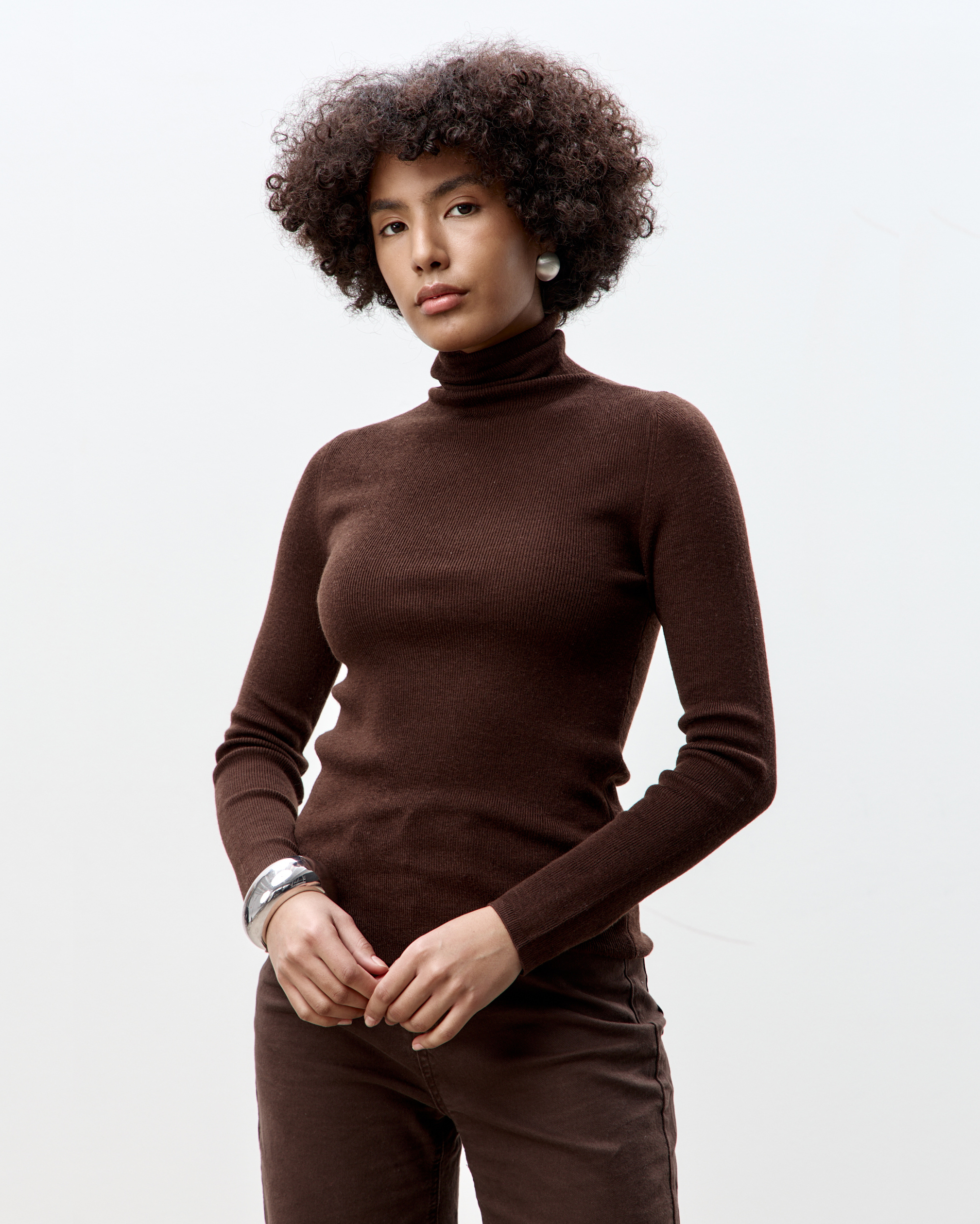 Водолазку облегающего силуэта выполнили из тонкого трикотажа из шерсти мериноса. Модель органично впишется в базовый гардероб.