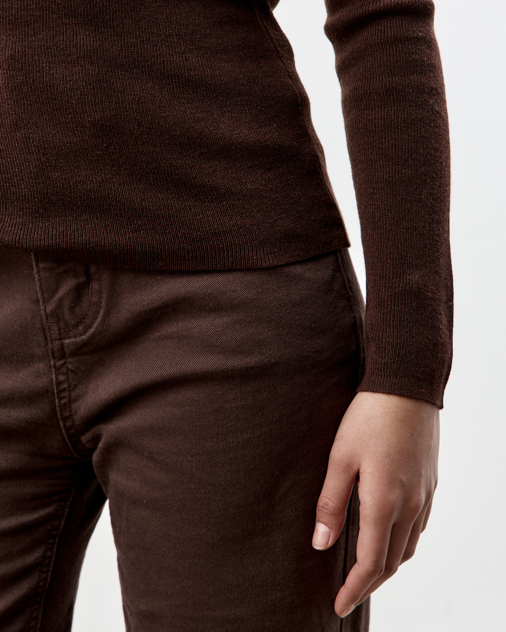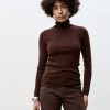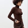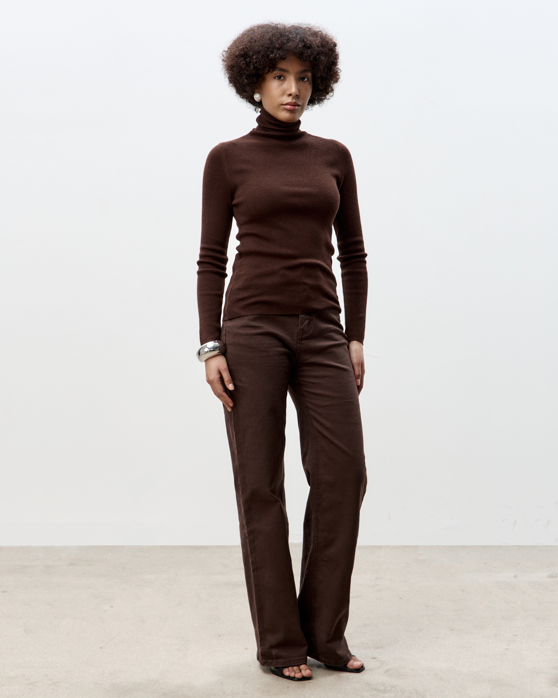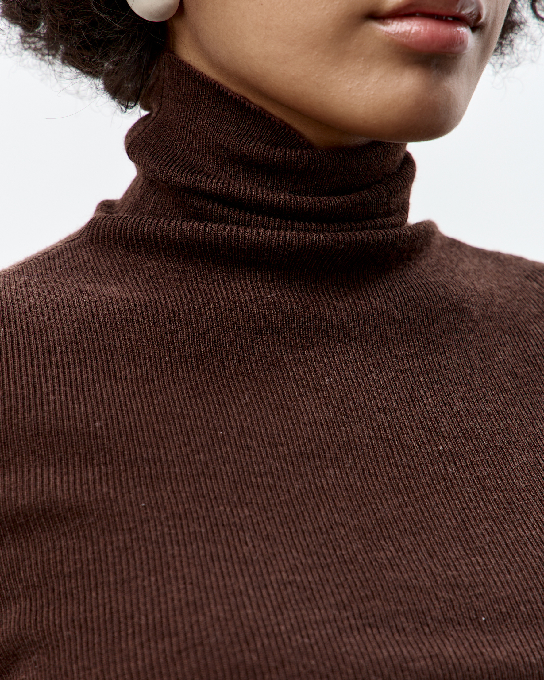 Водолазку облегающего силуэта выполнили из тонкого трикотажа из шерсти мериноса. Модель органично впишется в базовый гардероб.