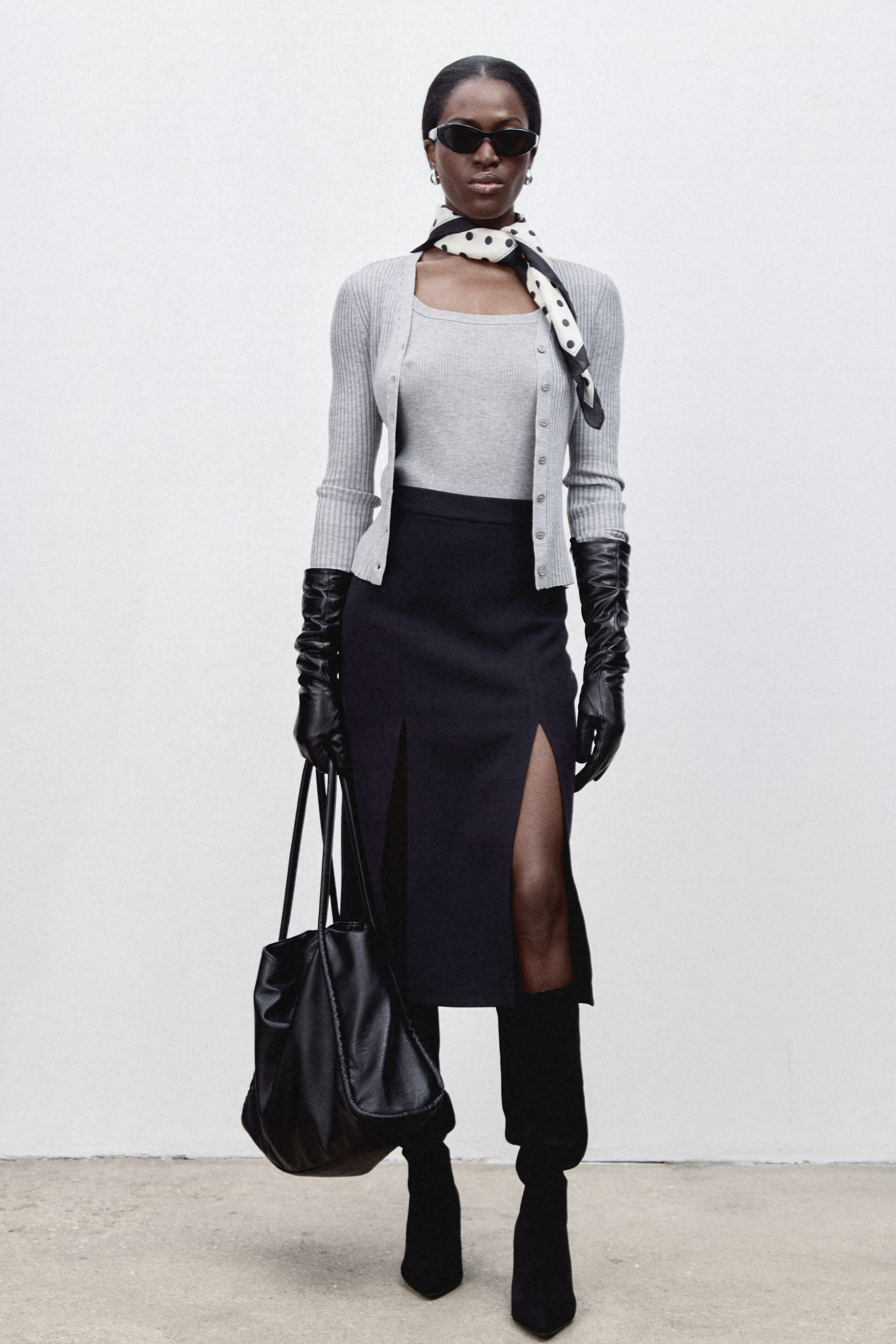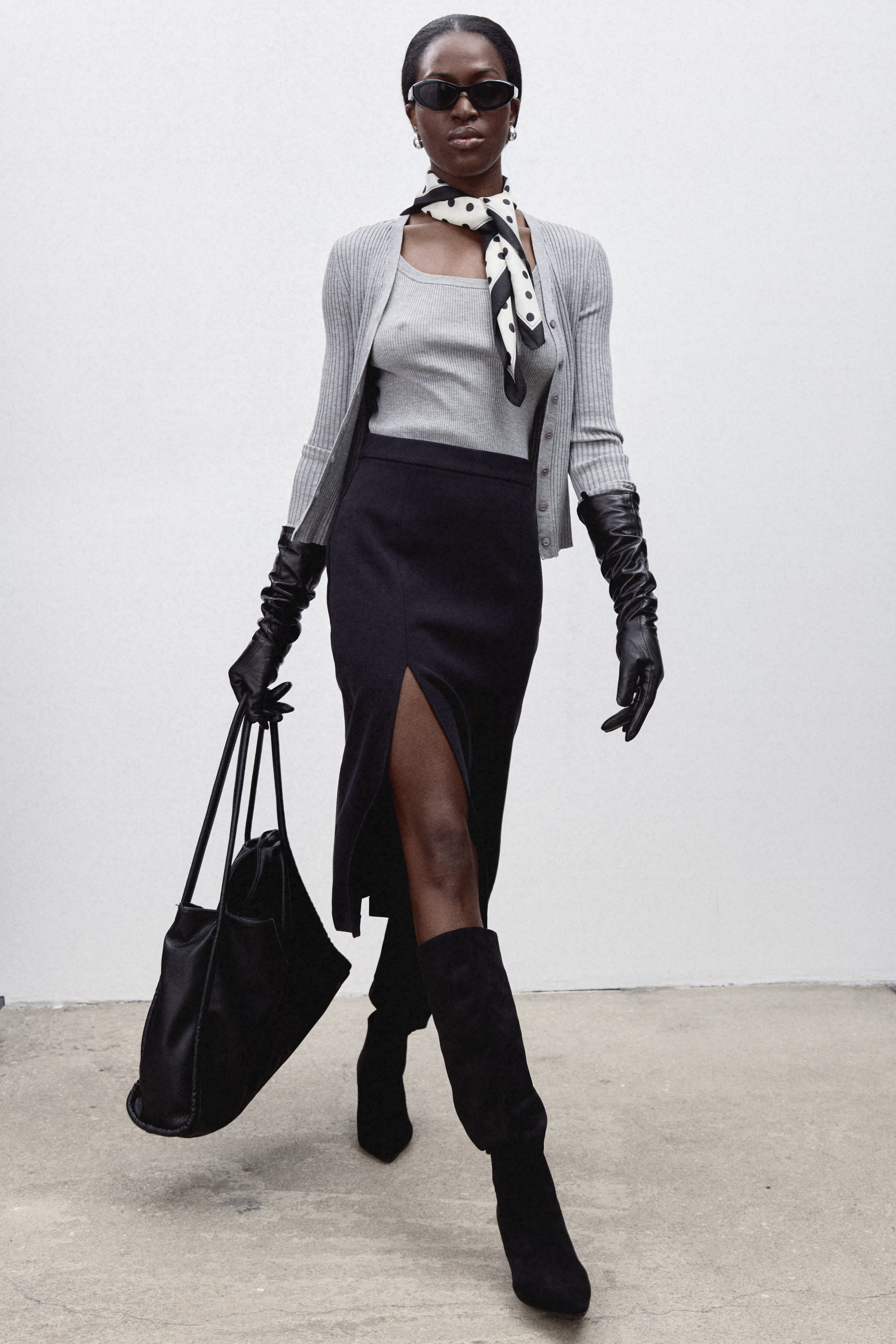 Градус формальности у строгой и элегантной юбки миди снижают высокие разрезы. Модель классического черного оттенка дизайнеры предлагают миксовать с укороченным топом и пиджаком мужского кроя, уравновешивающего провокационный look. Для пошива использовался плотный, но эластичный материал, который хорошо держит форму и при этом приятен к телу за счет нежных волокон вискозы.