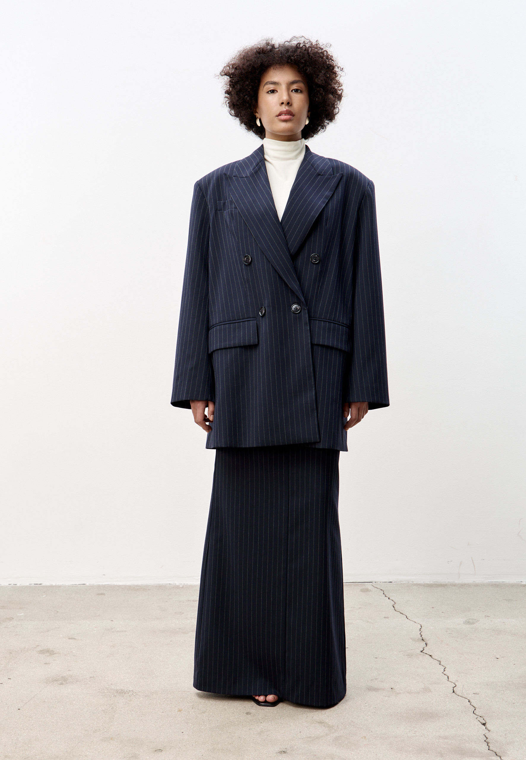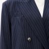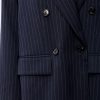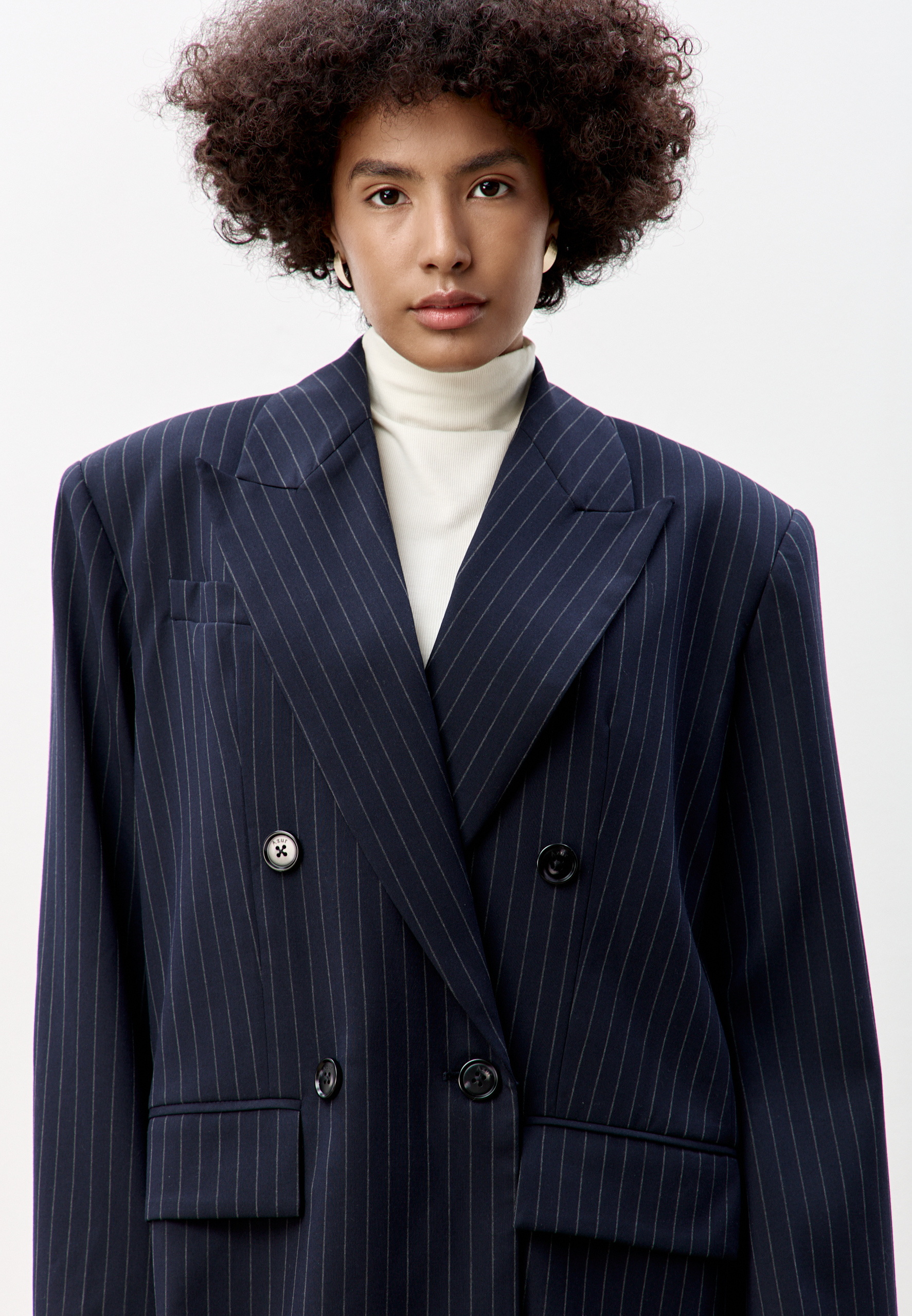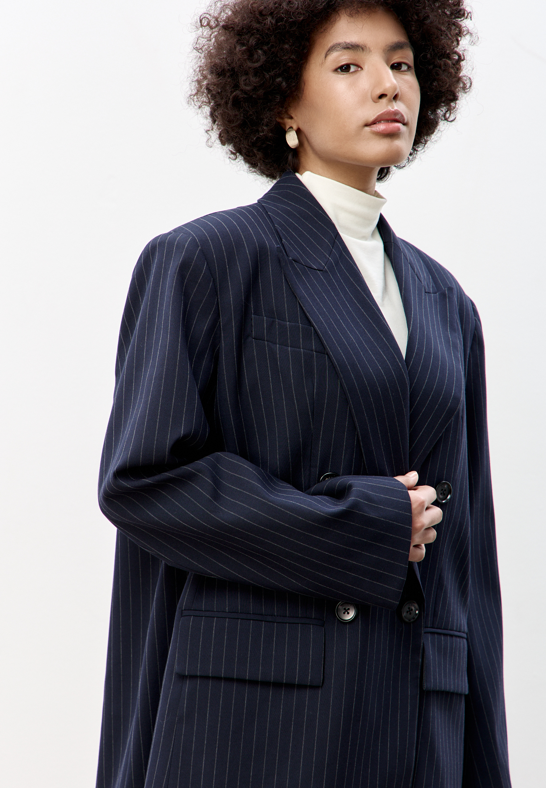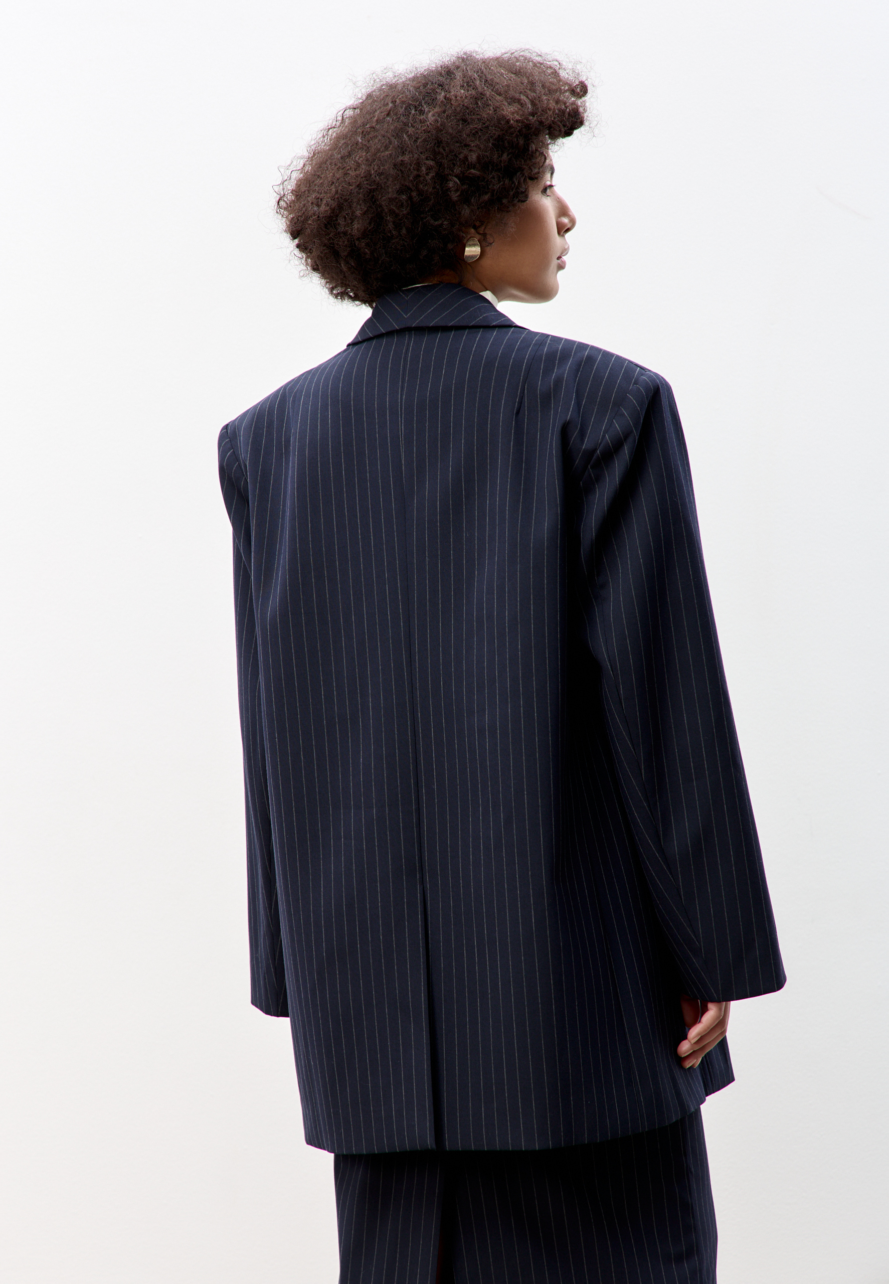 Свободный удлиненный жакет из легкой шерсти в тонкую полоску: двубортный, с увеличенным плечом и широкими лацканами.