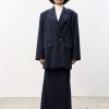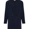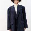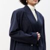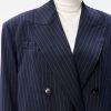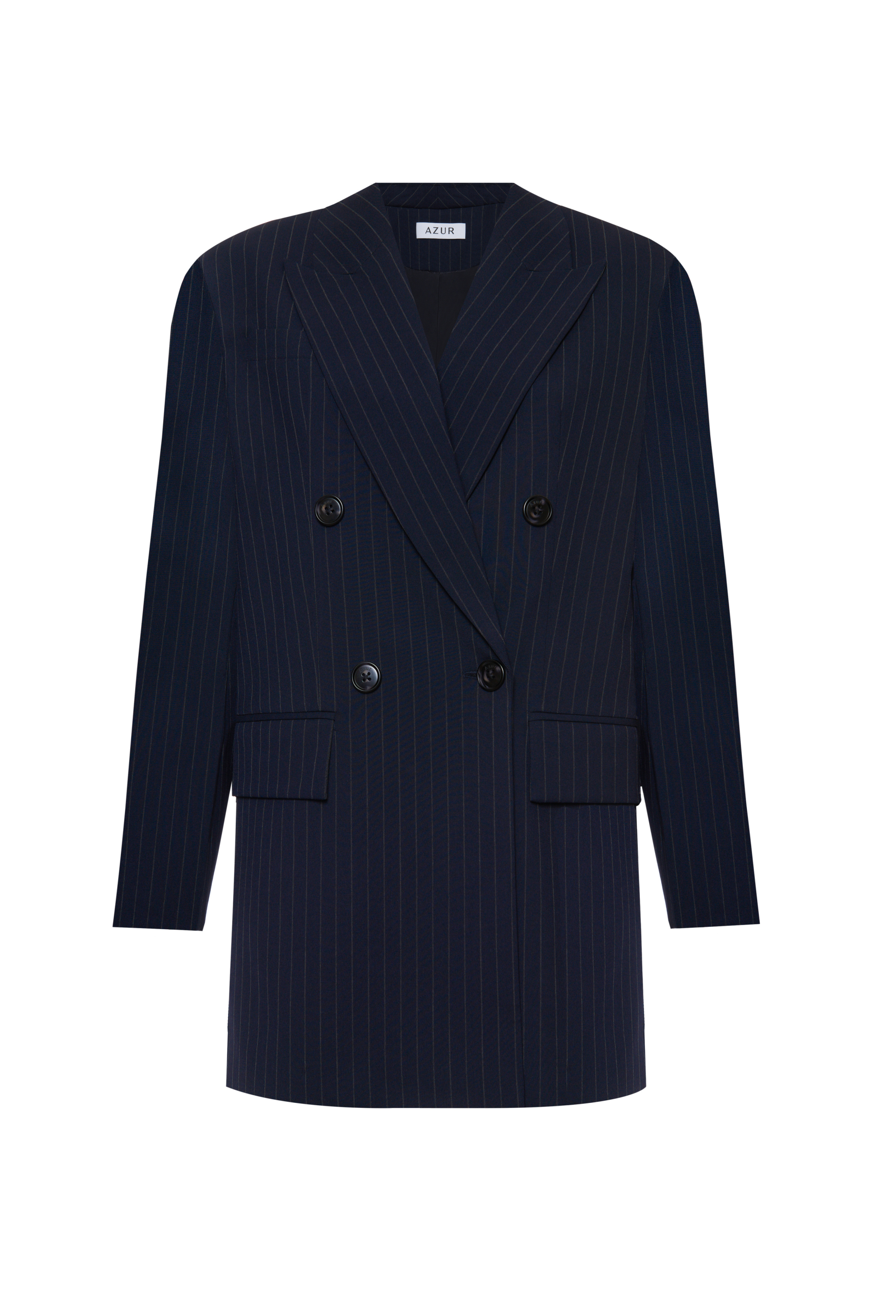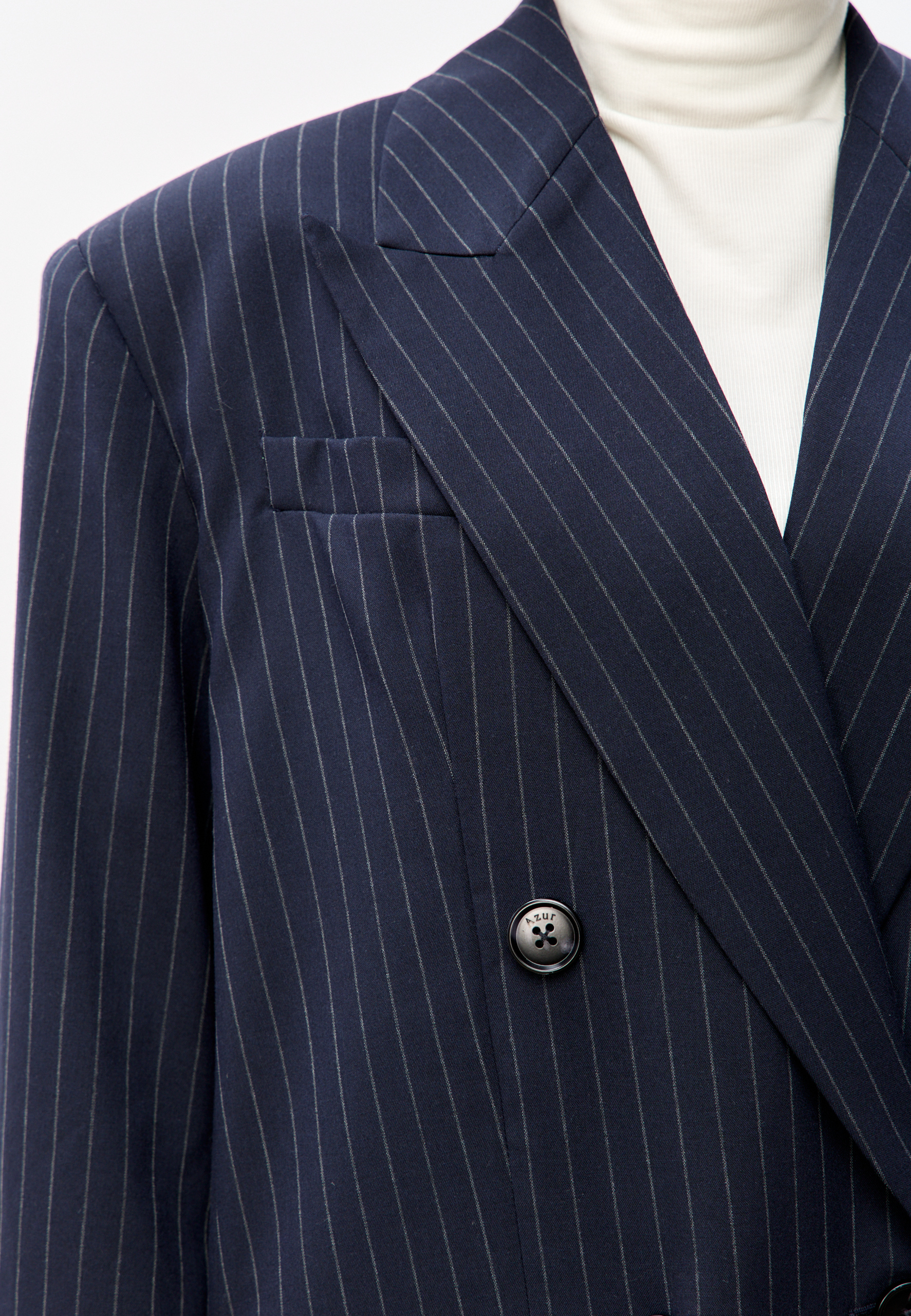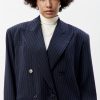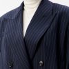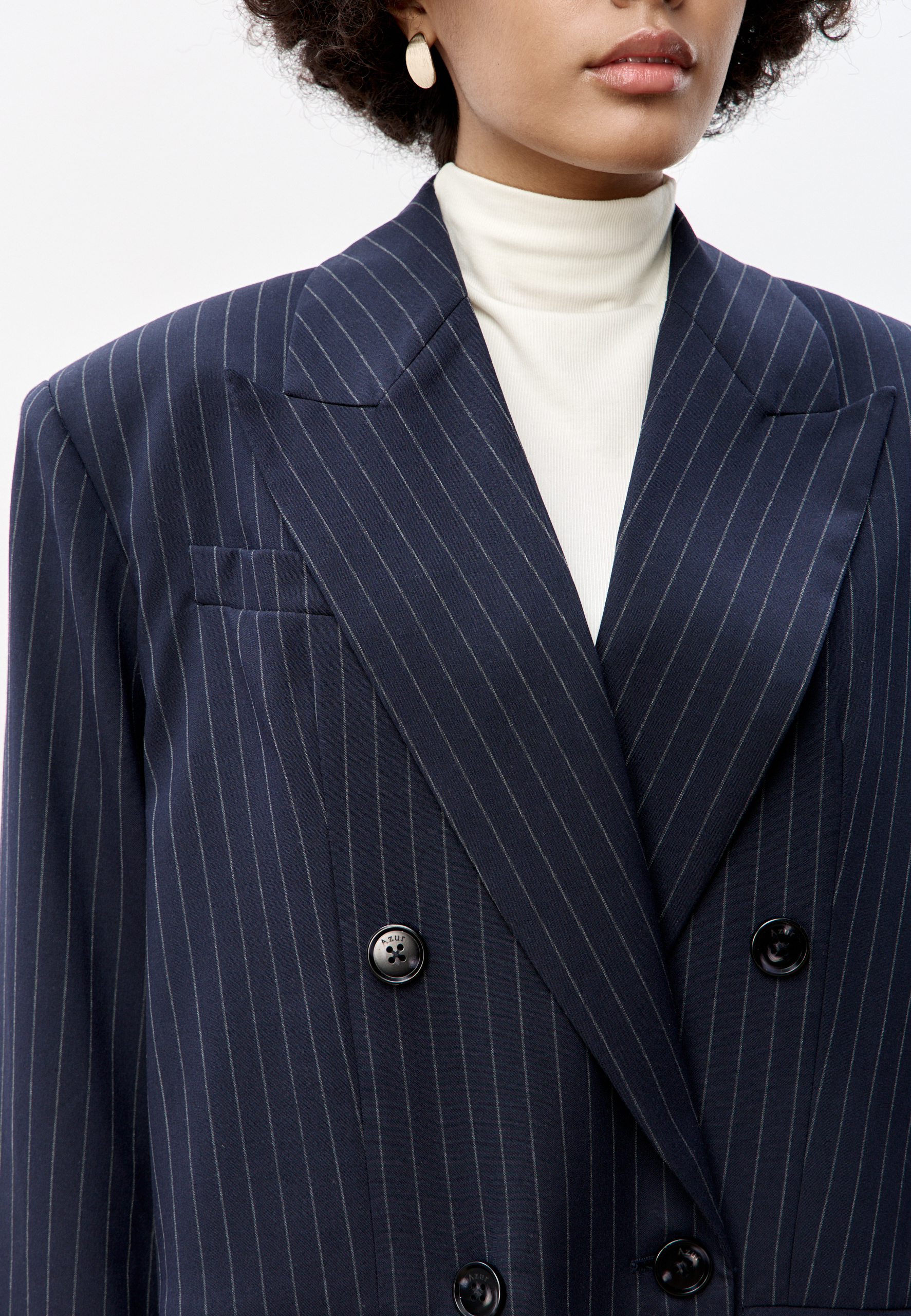Свободный удлиненный жакет из легкой шерсти в тонкую полоску: двубортный, с увеличенным плечом и широкими лацканами.