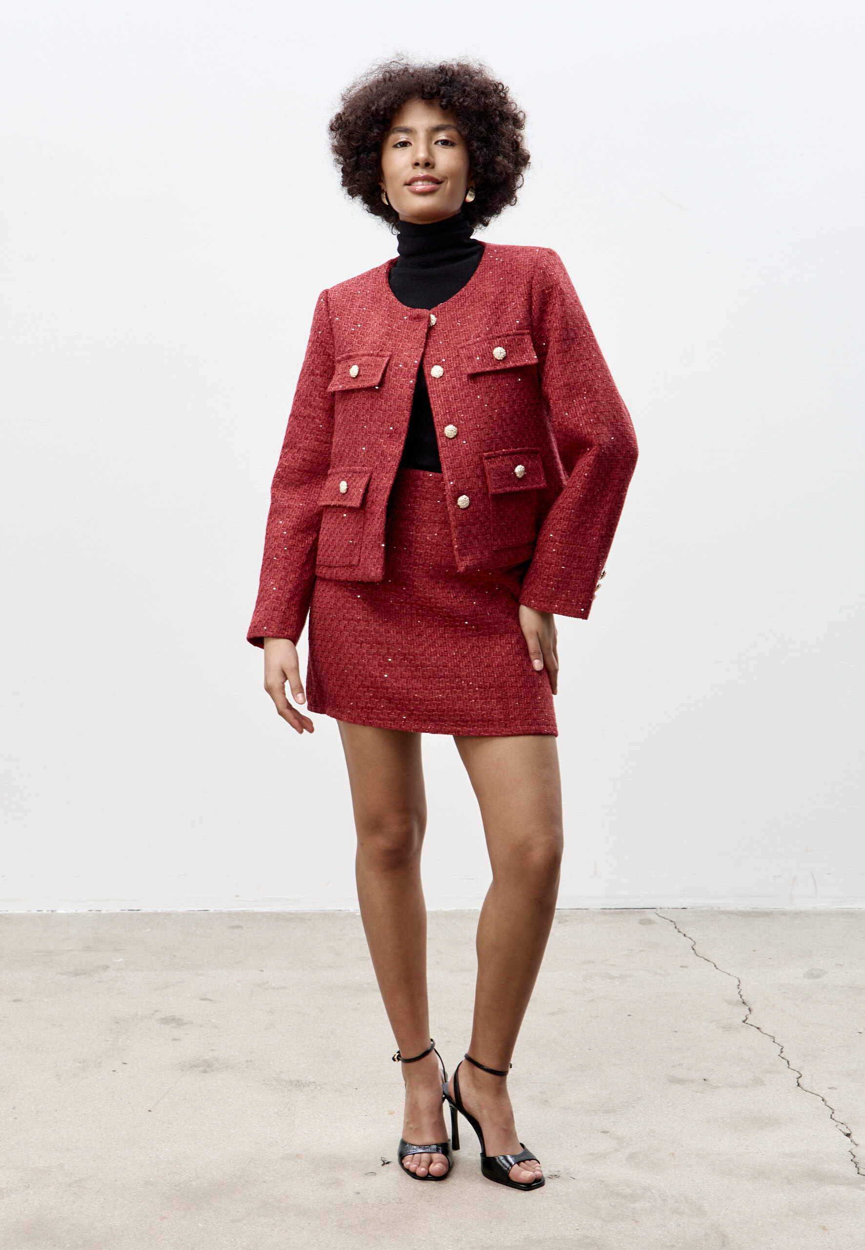 Укороченный жакет алого оттенка с круглым вырезом и карманами. Блеск поддерживают винтажные пуговицы и золотая нить. Рекомендуем сочетать с парной мини-юбкой, безрукавой и лодочками.